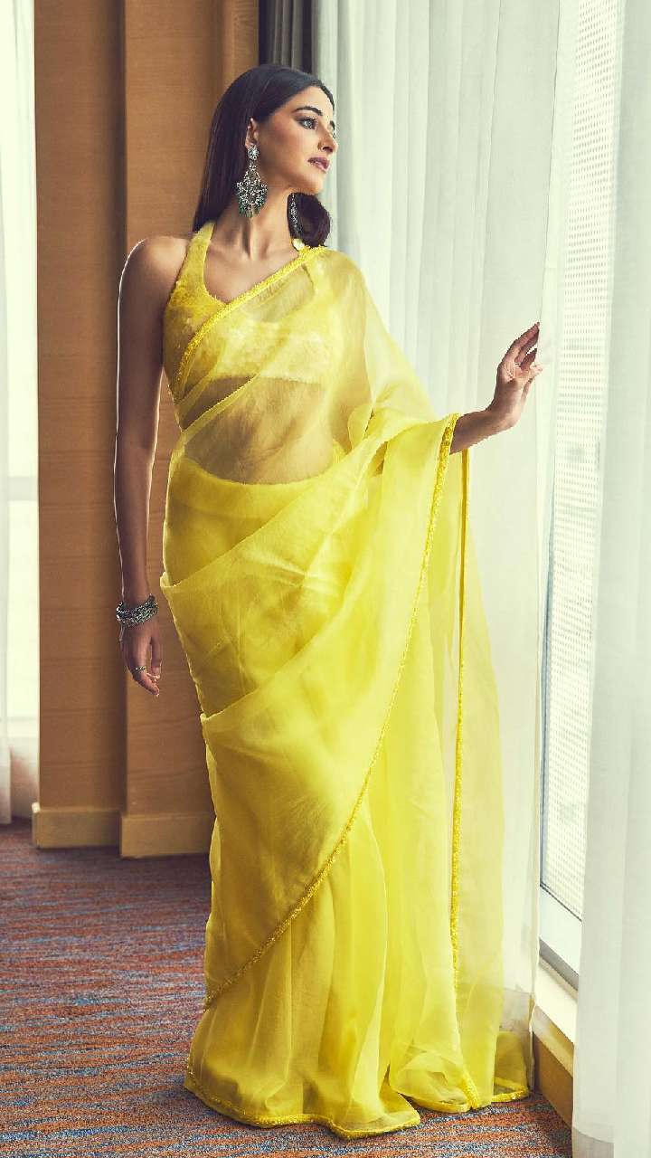 येलो कलर की नेट साड़ी के साथ अनन्या पांडे ने हॉल्टर नेक ब्लाउज पेयर किया है और साड़ी ओपन पल्ले के साथ पहनी है।