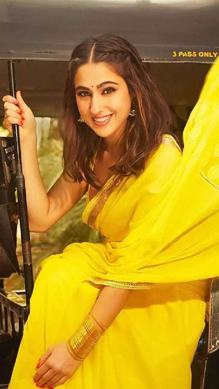 सारा अली खान भी इस येलो कलर की साड़ी में बहुत सुंदर लग रहीं हैं। आप साड़ी के साथ इस तरह की हेयर स्टाइल भी कर सकती हैं।