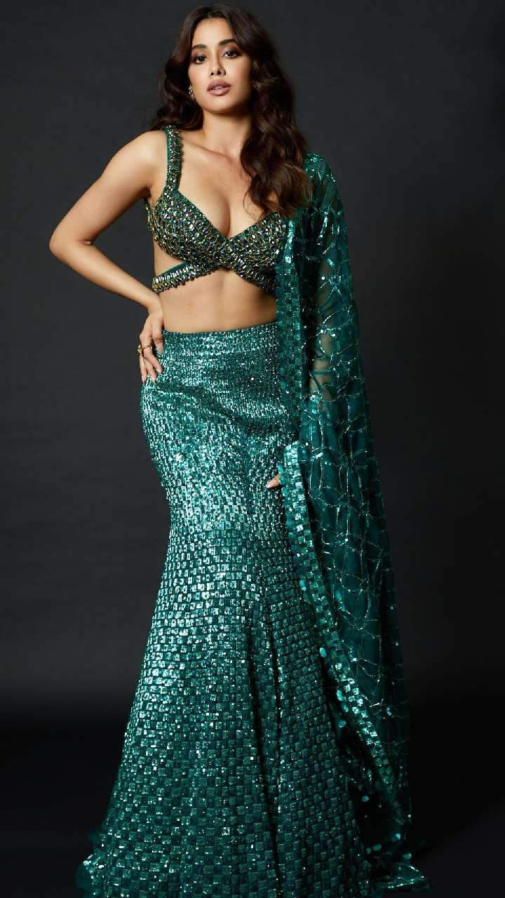 जान्ह्ववी का ये ग्रीन सेक्विन लहंगा डीपनैक चोली लुक आपके पार्टी लुक में चार चांद लगा देने वाला है।