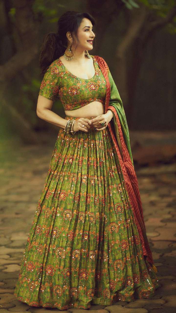 माधुरी का ये प्रिंटेड ग्रीन लहंगा लुक काफी ब्यूटीफुल लग रहा है। इसके साथ एक्ट्रेस ने कर्ल हेयर के साथ पौनी हेयर स्टाइल कैरी की है।
