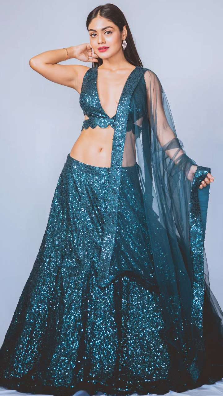 यंग गर्ल्स के लिए श्रीजिता का ये शिमरी लहंगा ओपन हेयर लुक बेस्ट है।