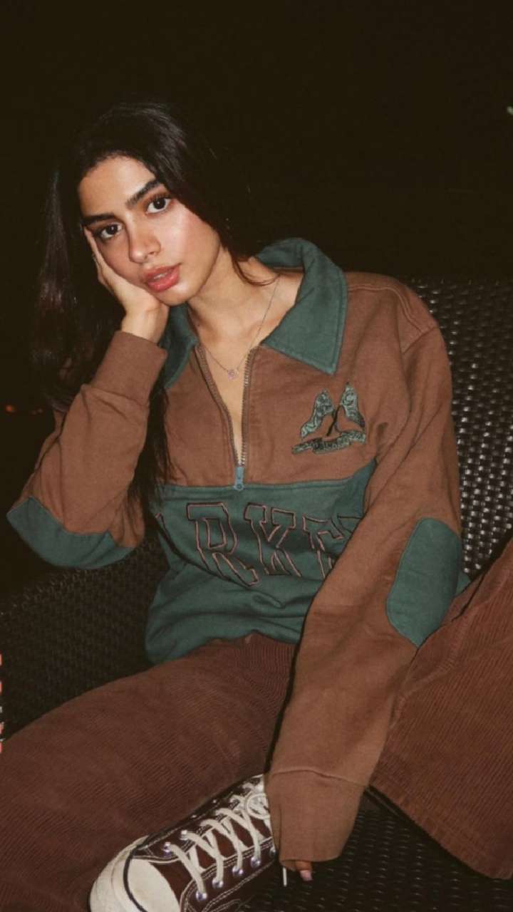 डार्क ब्राउन कलर के फुल ऑउटफिट के साथ न्यूड लिप्स खुशी कपूर की पर्सनैलिटी को काफी बोल्ड और बॉसी लुक दे रही है। आप इस स्टाइलिश लुक को कॉलेज और इवेंट में कैरी कर सकती हैं।