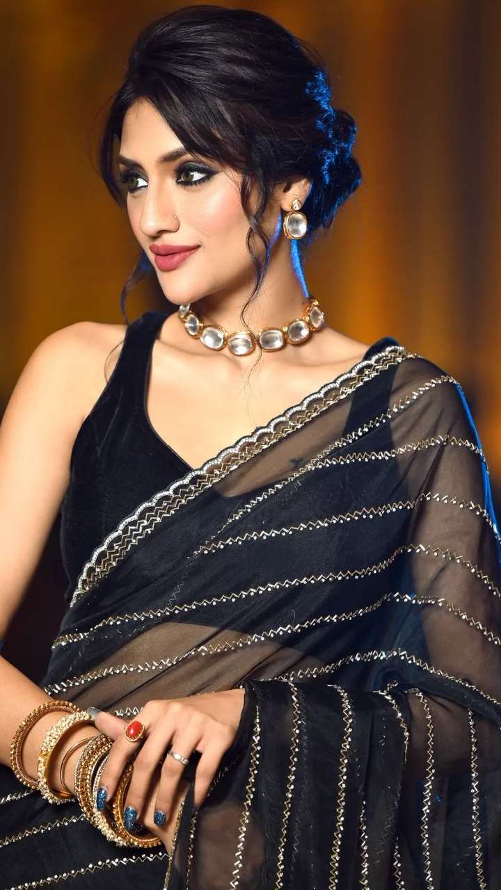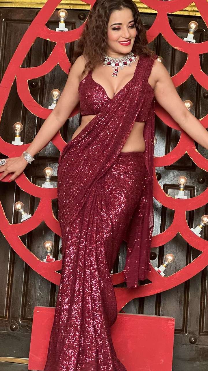 भोजपुरी एक्ट्रेस मोनालिसा का ये डार्क कलर शिमरी साड़ी संग डीपनैक ब्लाउज लुक आपको बेहद गॉर्जियस लुक देगा।