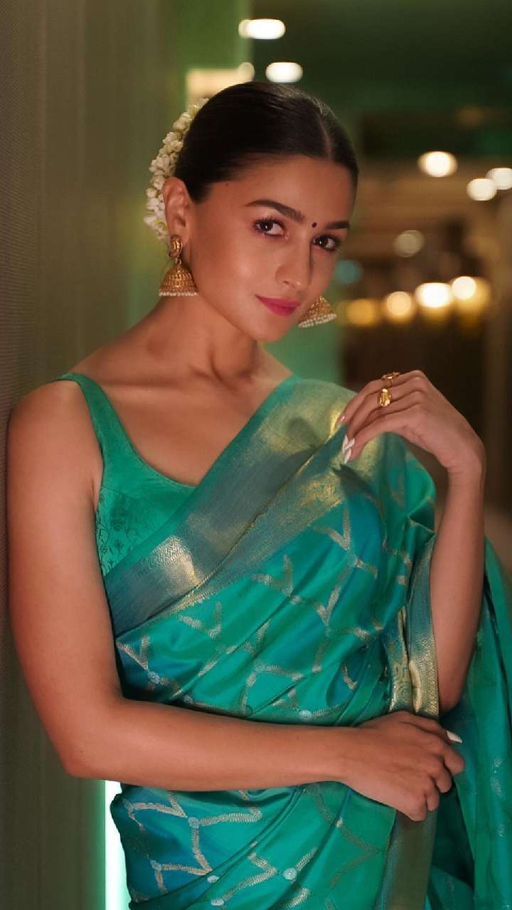 आलिया भट्ट की ये सिल्क साड़ी करवा चौथ के लिए बिल्कुल परफेक्ट है। आप आलिया की तरह ही बालों में गजरा लगा कर तैयार होए।