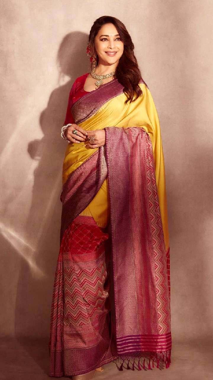 धक-धक गर्ल माधुरी दीक्षित आज भी जवां नजर आती हैं। करवा चौथ पर आप माधुरी के इस साड़ी लुक से अपने लुक में चार चांद लगा सकती हैं।