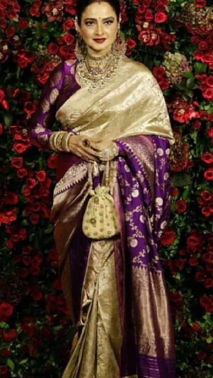 बॉलीवुड की एवरग्रीन एक्ट्रेस रेखा अपनी साड़ी लुक्स के लिए काफी ज्यादा पॉपुलर हैं। एक्ट्रेस की ये गोल्डन और पर्पल साड़ी भी परफेक्ट है।