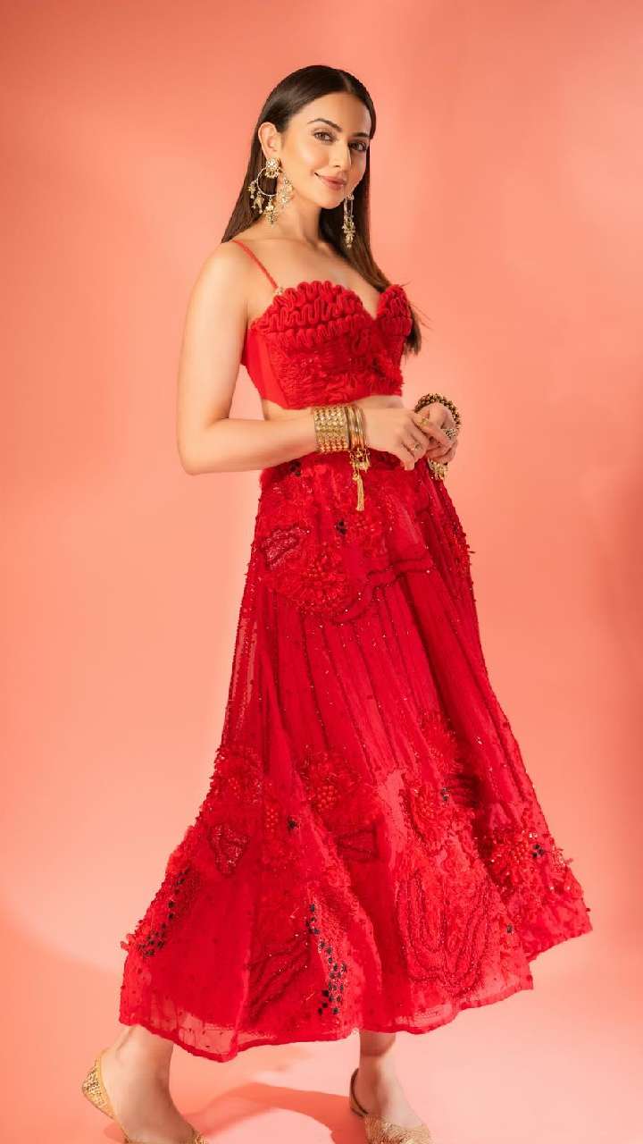 रकुल प्रीत ने रेड कलर की शार्ट ड्रेस में अपना हॉट लुक शेयर किया है। इसके साथ उन्होंने गोल्डन बिग ईयररिंग कैरी किए हैं।