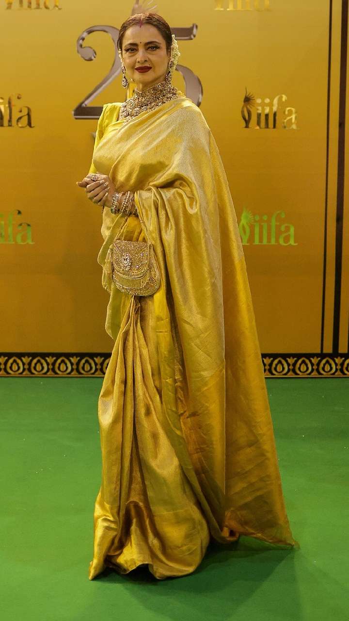 रेखा ने आईफा अवॉर्ड्स के इवेंट में एकदम महारानी जैसा लुक कैरी किया है, जिसमें उन्होंने गोल्डन कांजीवरम साड़ी के साथ गोल्डन हैंडबैग और ज्वेलरी को स्टाइल किया है। साथ ही, एक्ट्रेस का मेकअप लोगों का दिल जीत लेते हैं।