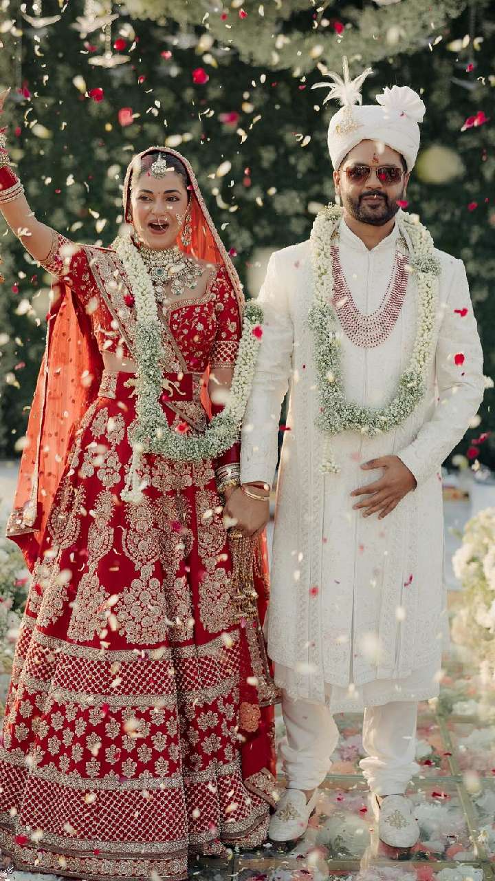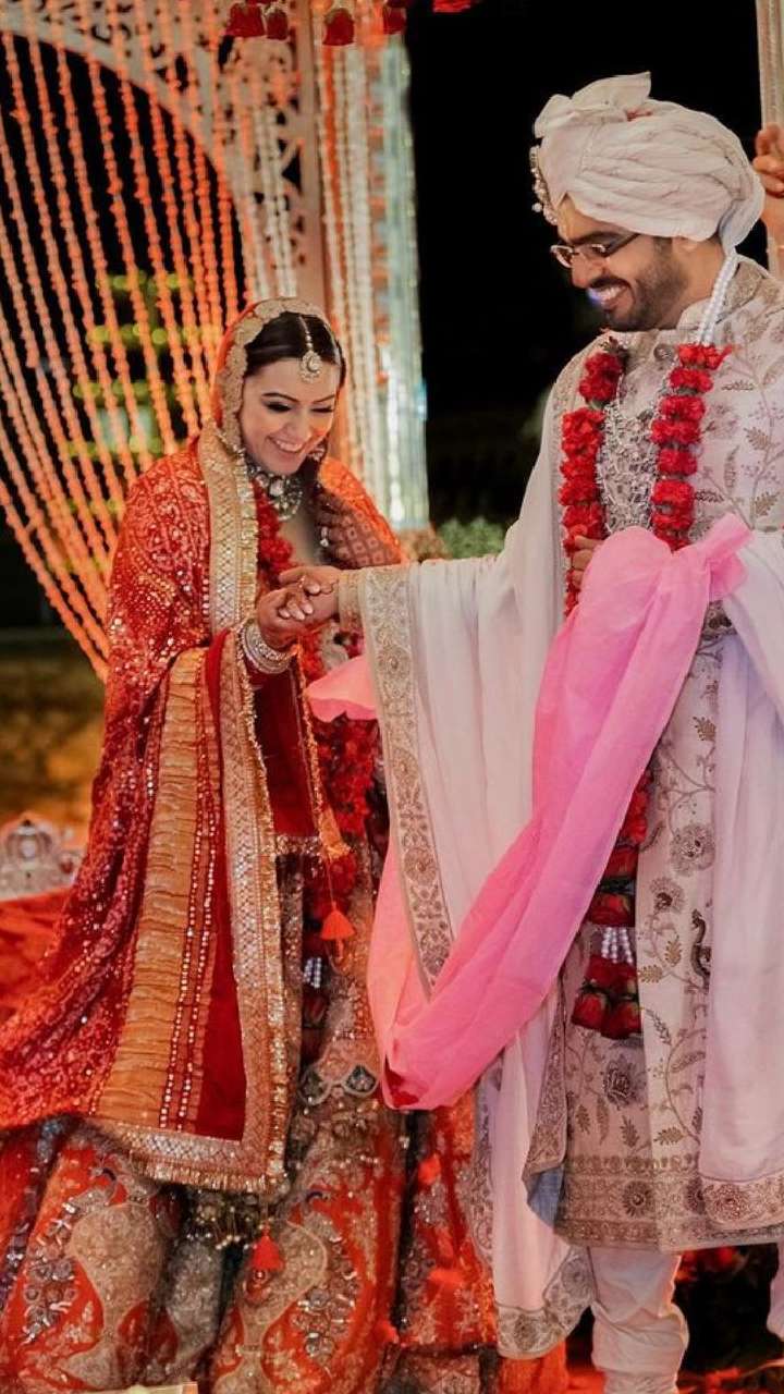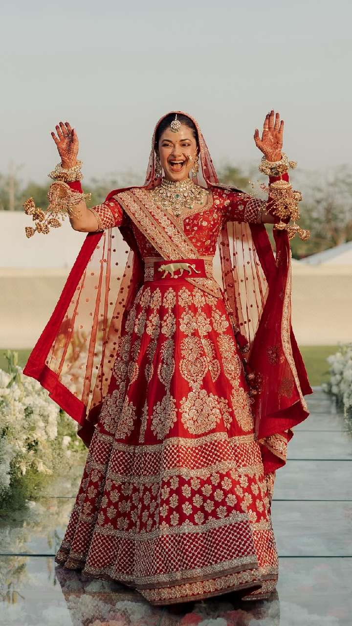 प्रियंका चोपड़ा की बहन मीरा चोपड़ा ने अपनी शादी में लाल रंग का जोड़ा पहना था। लाल रंग के हैवी वर्क लहंगे में एक्ट्रेस बहुत प्यारी लग रहीं थी।