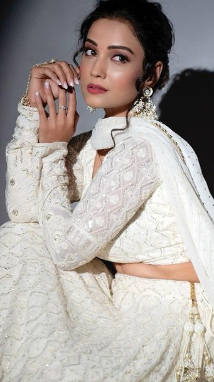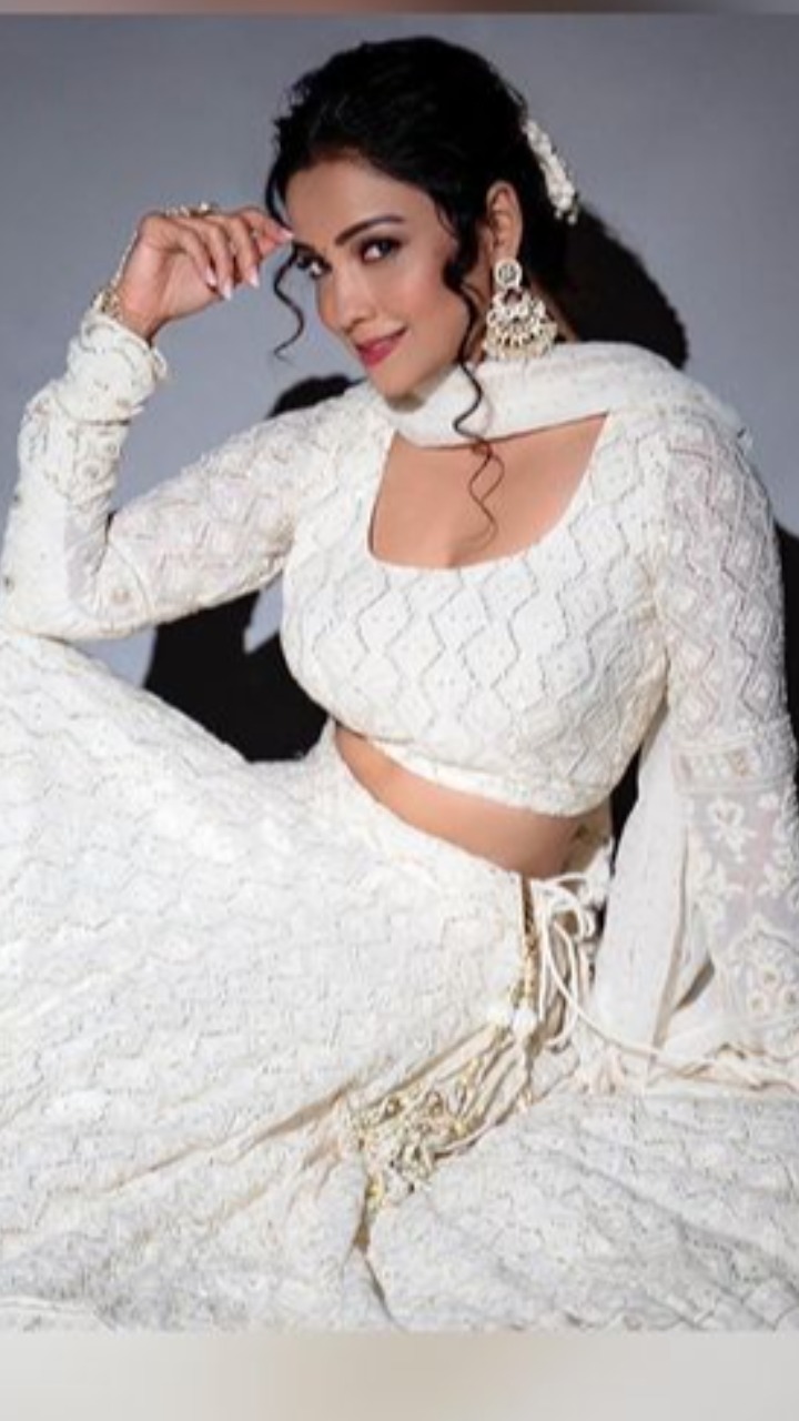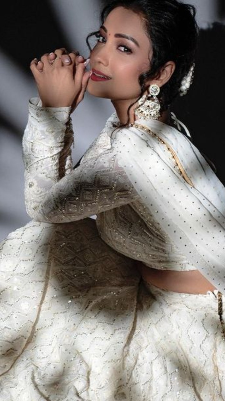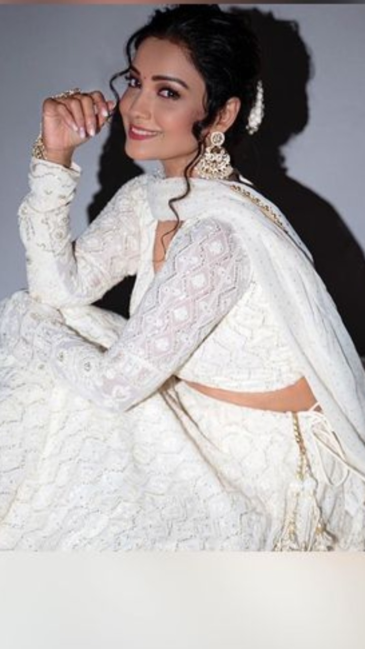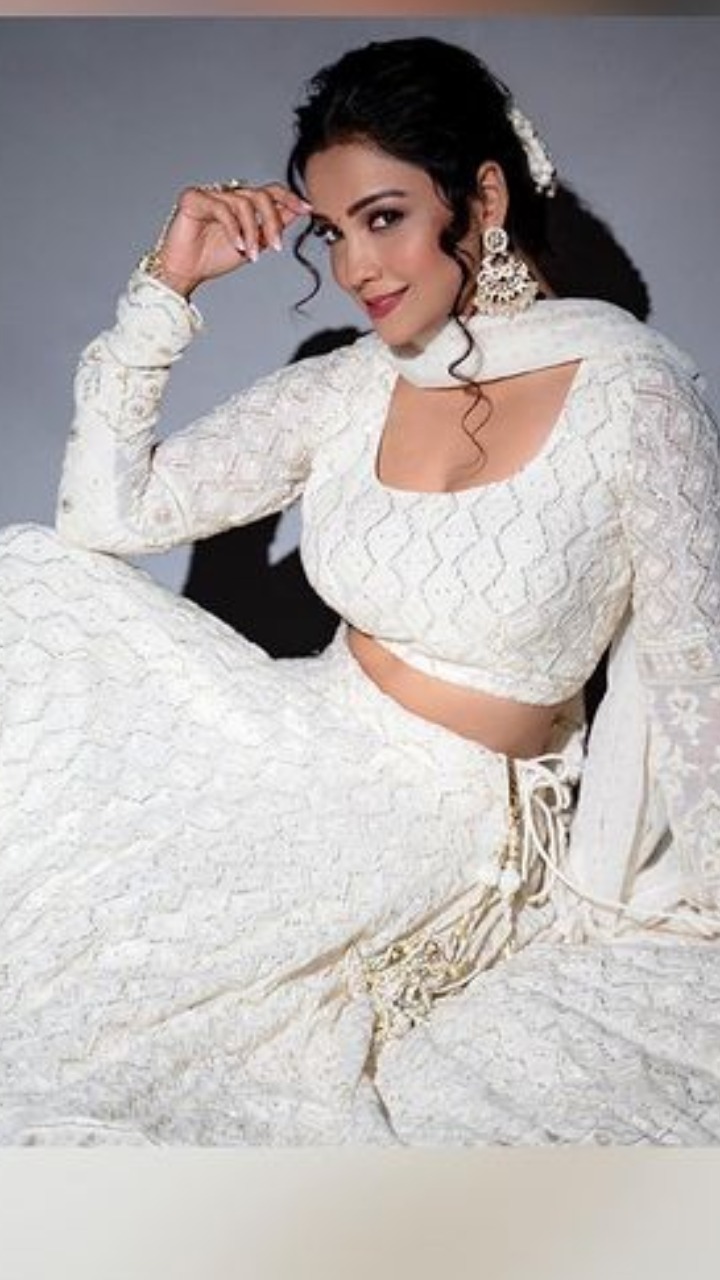 एक्ट्रेस ने व्हाइट कलर की डिजाइनर चनिया चोली, कानों में मैचिंग झुमका और बालों में गजरा लगाया हुआ है।