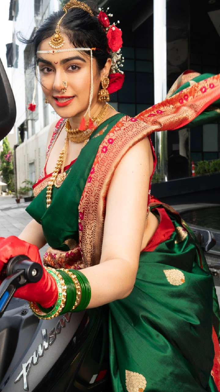 मराठी साड़ी में एक्ट्रेस की ये अदा हर किसी को उनका दीवाना बना दे। एक्ट्रेस इस फोटो में मराठी साड़ी के साथ बाइक पर बैठी हैं।