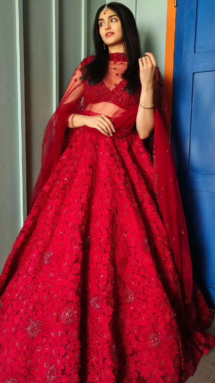 अदा रेड कलर के चमचमाते लहंगे नेटिड दुपट्टे वी नेक चोली में ग्लैमरस ब्यूटी लग रही हैं। रिस्पेप्शन पार्टी में आपके लुक में चार चांद लगा देगा।