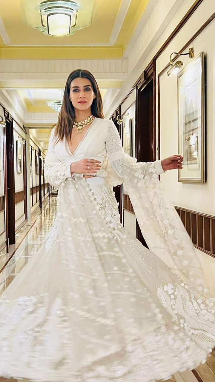 व्हाइट कलर के इस लहंगे में कृति सेनन बिल्कुल अप्सरा लग रहीं हैं, एक्ट्रेस का ये लुक किसी भी फंक्शन के लिए परफेक्ट है।