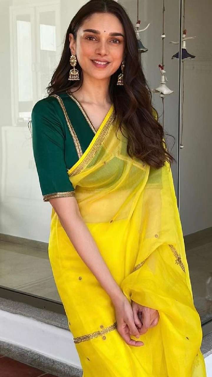 अदिति राव हैदरी येलो साड़ी और ग्रीन ब्लाउज पहने बला की खूबसूरत दिख रही हैं।