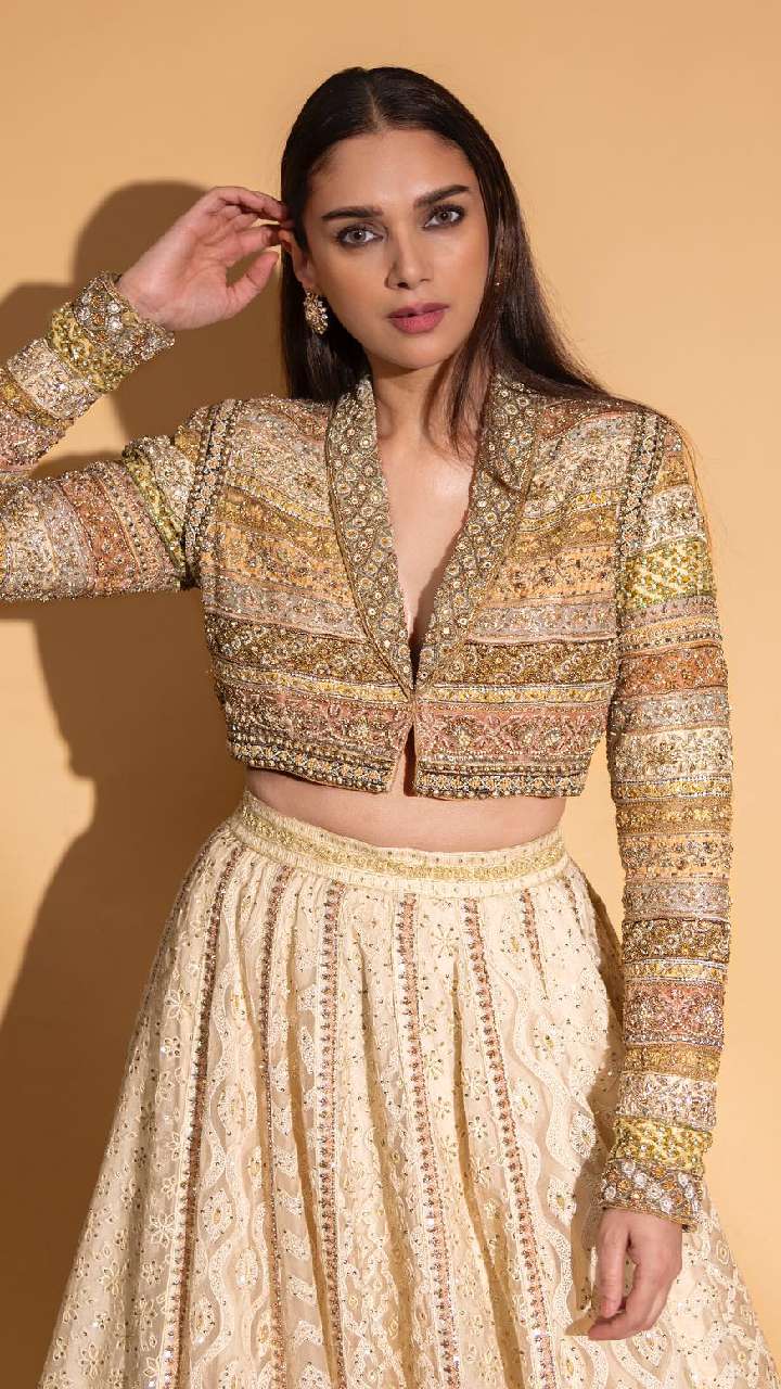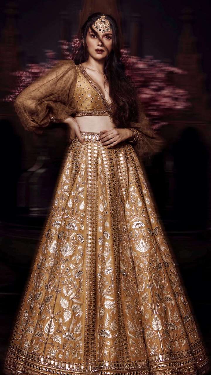 वेडिंग सीजन में अदिति राव के जैसा गोल्डन शिमरी वर्क लहंगा डीप नेक नेटिड स्लीव्स चोली आपको स्टाइलिश लुक देगी। ऐसे में आप इससे आइडिया ले सकती हैं।
