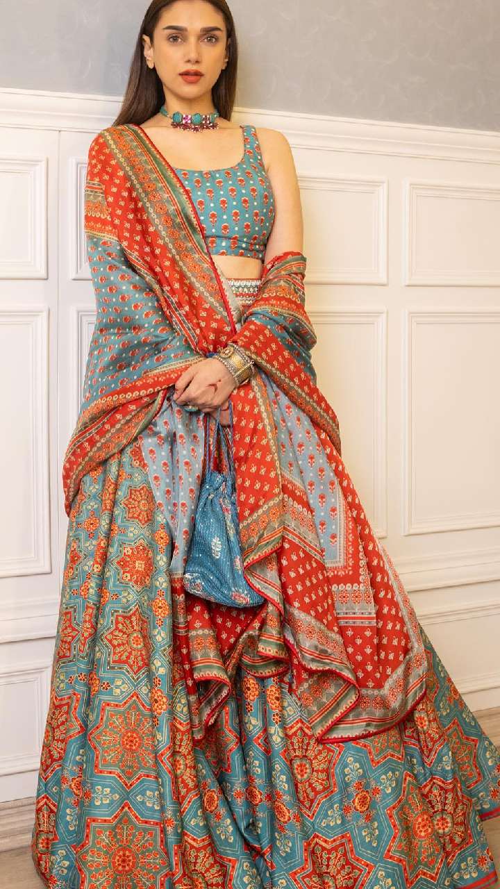 अदिति का प्रिंटेड लहंगा स्लीवलेस चोली लुक बेहद खूबसूरत लुक दे रहा है। एक्ट्रेस ने इसके साथ मैचिंग चोकर पहना हुआ है।
