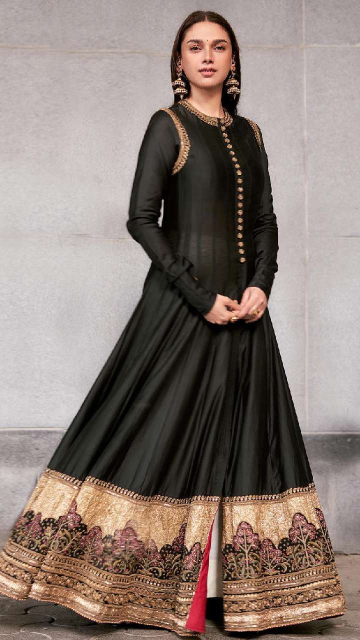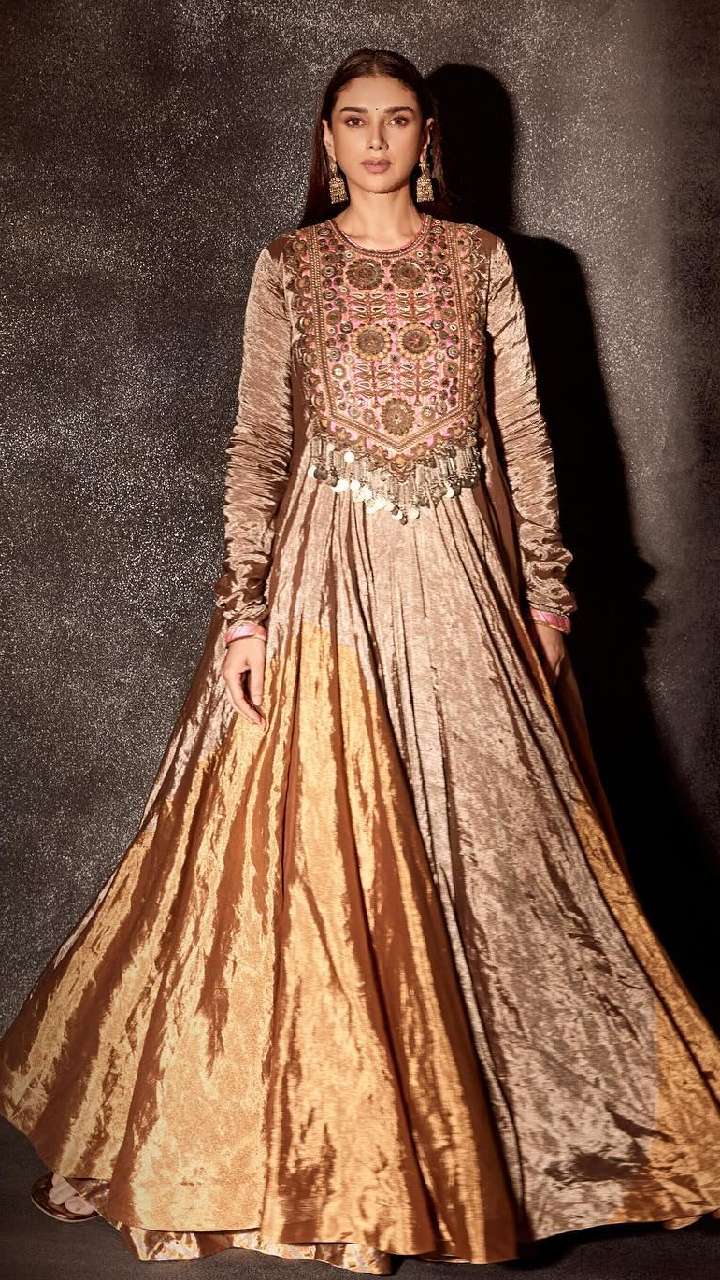गोल्डन कलर के अनारकली सूट में अदिति राव हैदरी का लुक काफी ज्यादा शानदार लग रहा है। इस तरह के सूट में आप लंबी और पतली दिखेंगी।