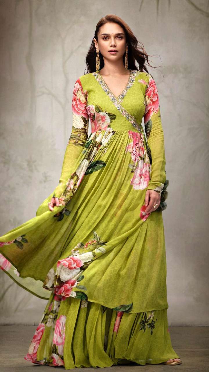 लेडीज संगीत में अदिति का फ्लोरल प्रिंट अंगरखा अनारकली सूट आपको एकदम चांद सी चमक देगा। ऐसे में आ इससे भी आइडिया ले सकती हैं।