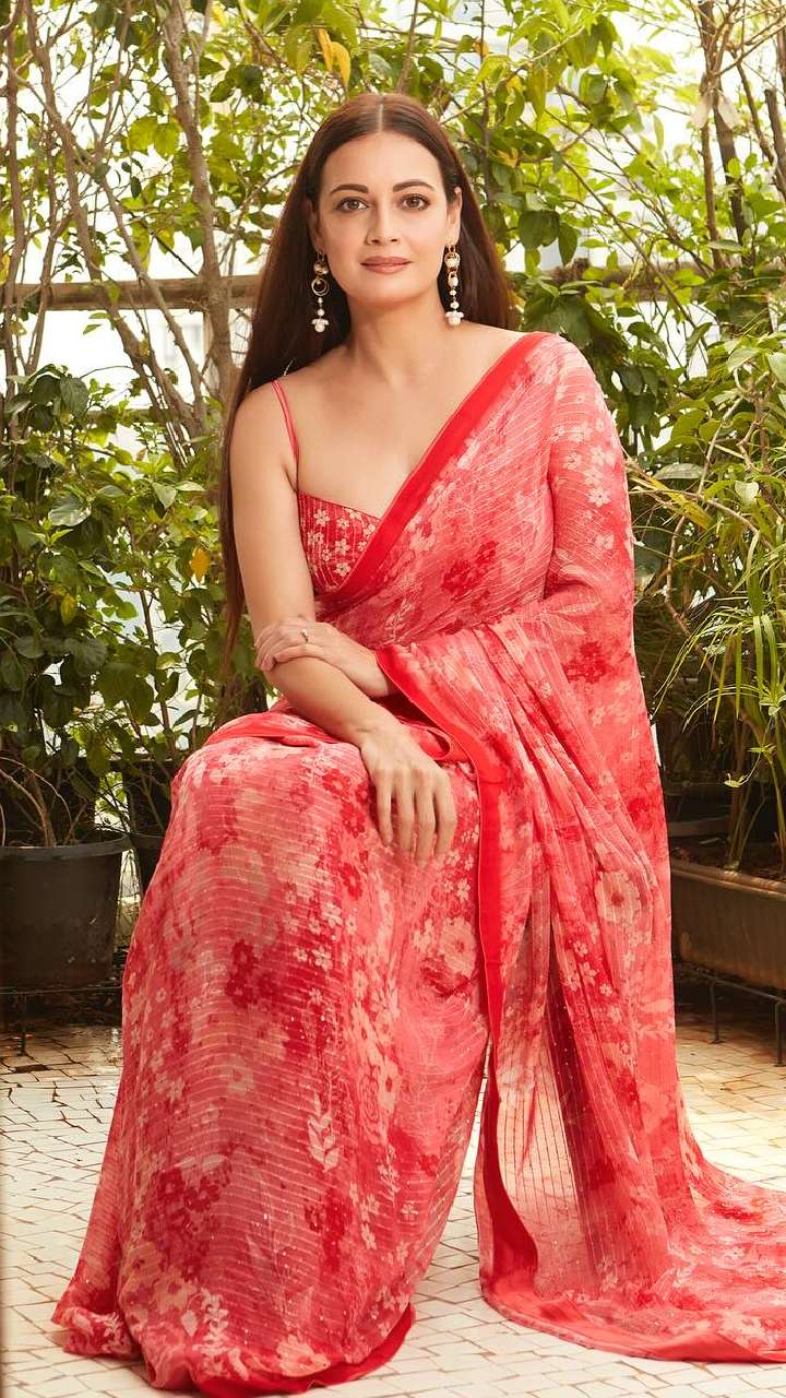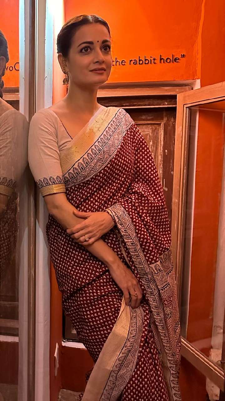 आप दिया मिर्जा की मरून कलर की प्रिंटेड बॉर्डर साड़ी को भी ऑप्शन में रख सकती हैं। इसके संग उन्होंने बन फोर्थ स्लीव्स ब्लाउज पहना हुआ है।
