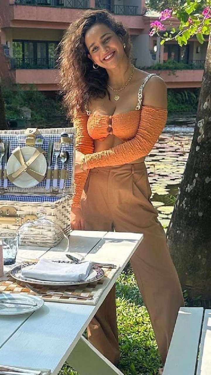 सत्यमेव जयते एक्ट्रेस तस्वीर में ऑरेंज ब्रालेट और ब्राउन पैंट में अदाएं देती बेहद कमाल की लग रही हैं।