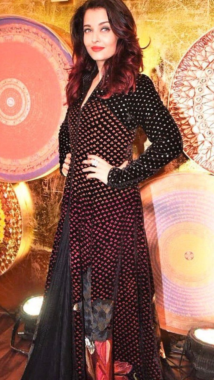 एक्ट्रेस ने तस्वीर में फ्लोर लेंथ, प्रिंटेड अनारकली जैकेट और ब्लैक स्कर्ट पहन रखी हैं।