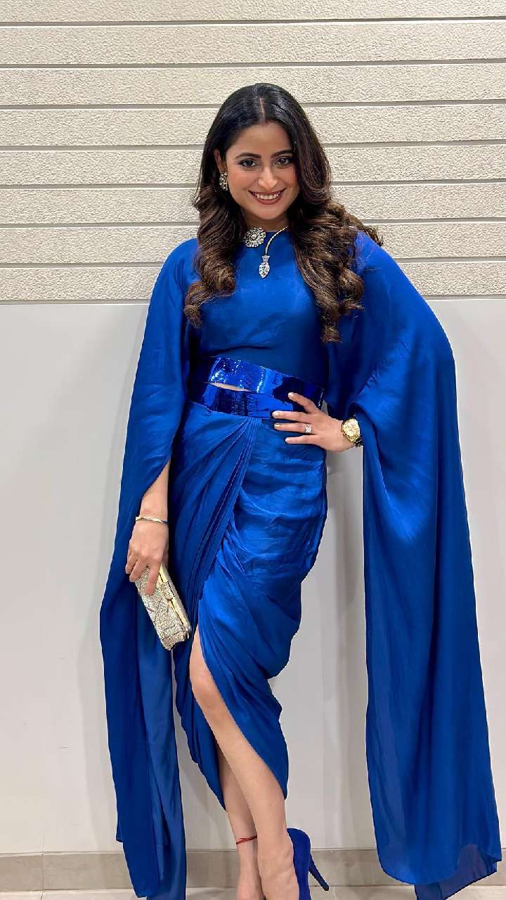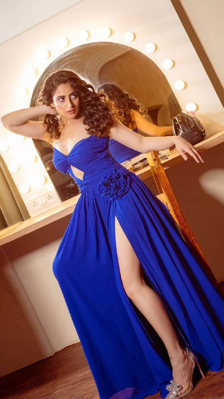 अभिनेत्री ब्लू कलर के कट आउट गाउन में बेहद हॉट अंदाज में नजर आ रही हैं। इसके साथ उनका ग्लॉसी मेकअप कर्ली हेयर शानदार लग रहे हैं।