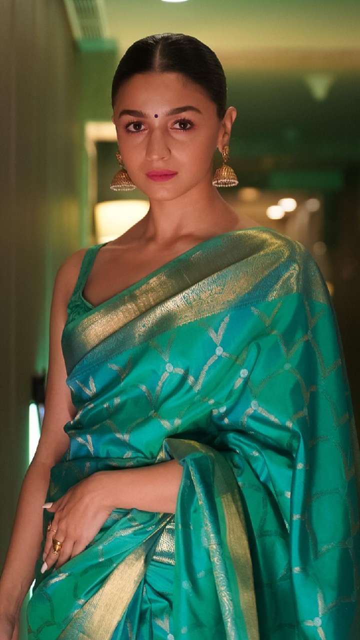 इन दिनों सिल्क साड़ियां काफी ट्रेंड में हैं। ऐसे में आप डीवा के इस ग्रीन जरी बॉर्डर सिल्क साड़ी कट स्लीव्स ब्लाउज से खुद को रॉयल लुक दे सकती हैं। सिल्क साड़ी के साथ आलिया की गोल्डन झुमकी और बन हेयर स्टाइल काफी सूट कर रहा है।