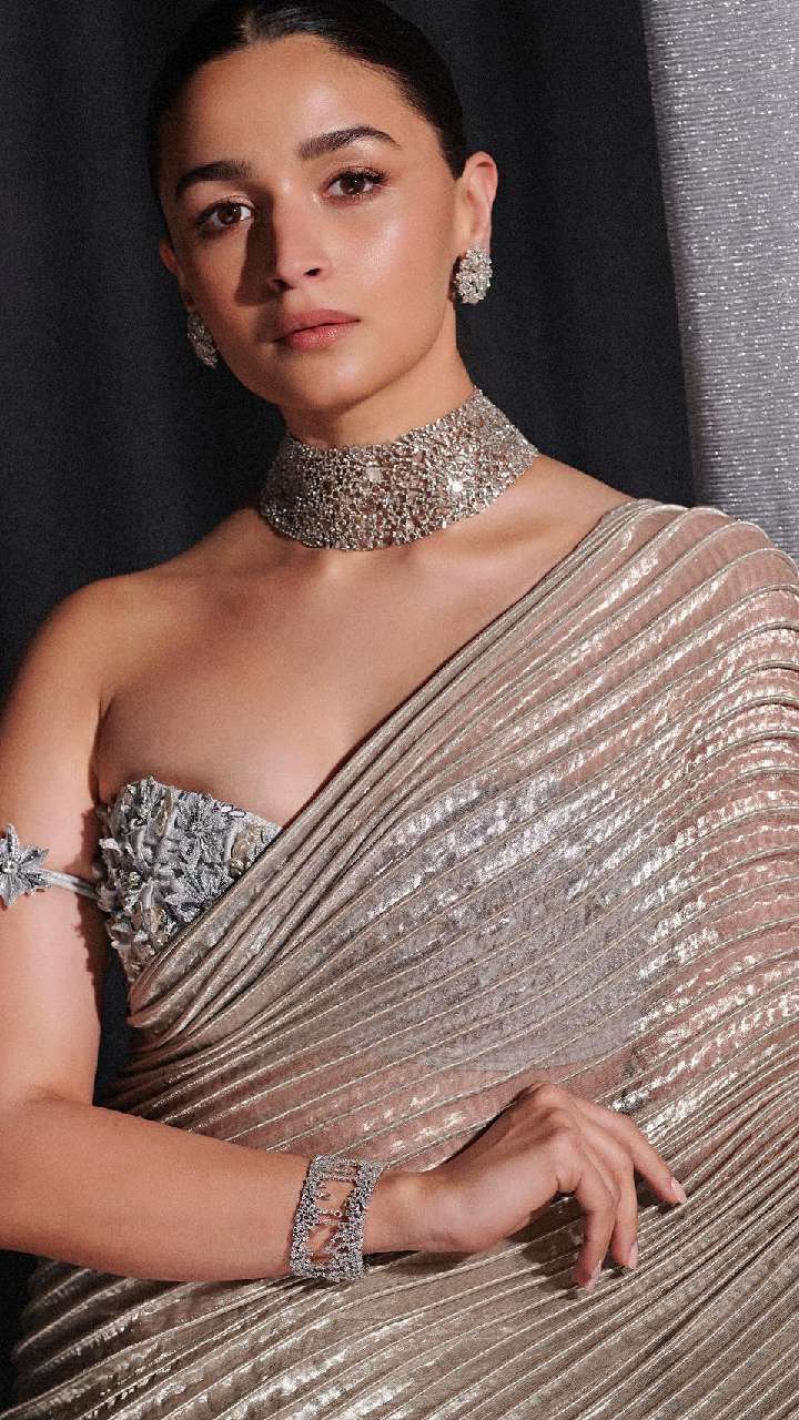 आप भी अभिनेत्री की तरह क्रैप फैब्रिक सिल्वर साड़ी ऑफ शोल्डर ब्लाउज से खुद को रिसेप्शन पार्टी में हॉट बना सकती हैं। इसके साथ आलिया ने सिल्वर नेकपीस स्टड और ग्लॉसी मेकअप किया हुआ है।