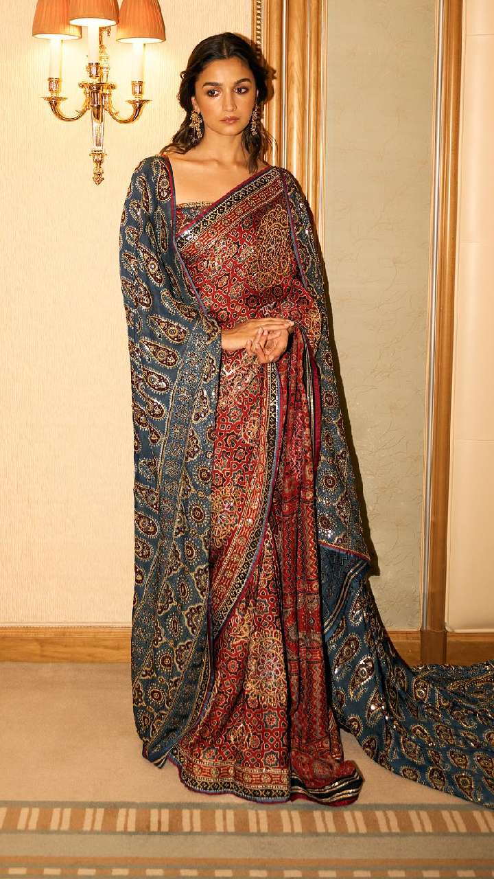 आलिया ने प्रिंटेड साड़ी के साथ कंट्रास्ट कलर शॉल हाफ हेयर स्टाइल से खुद को स्टाइलिश लुक दिया हुआ है।