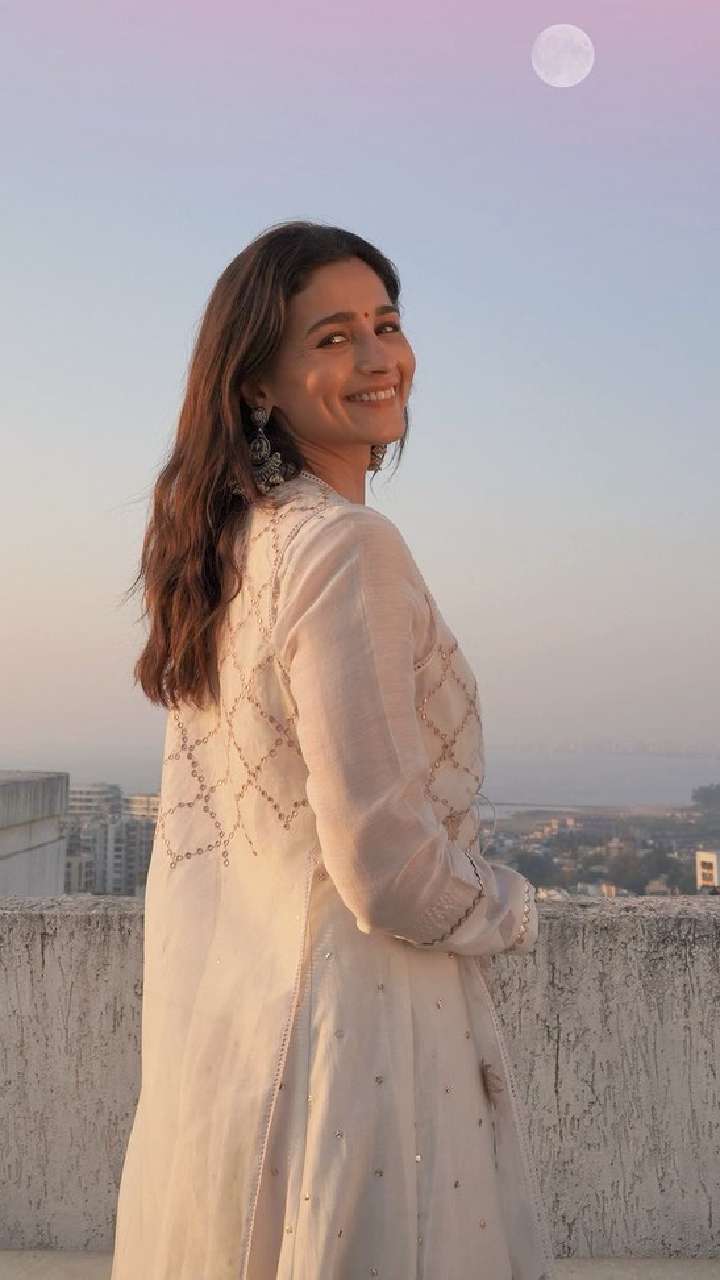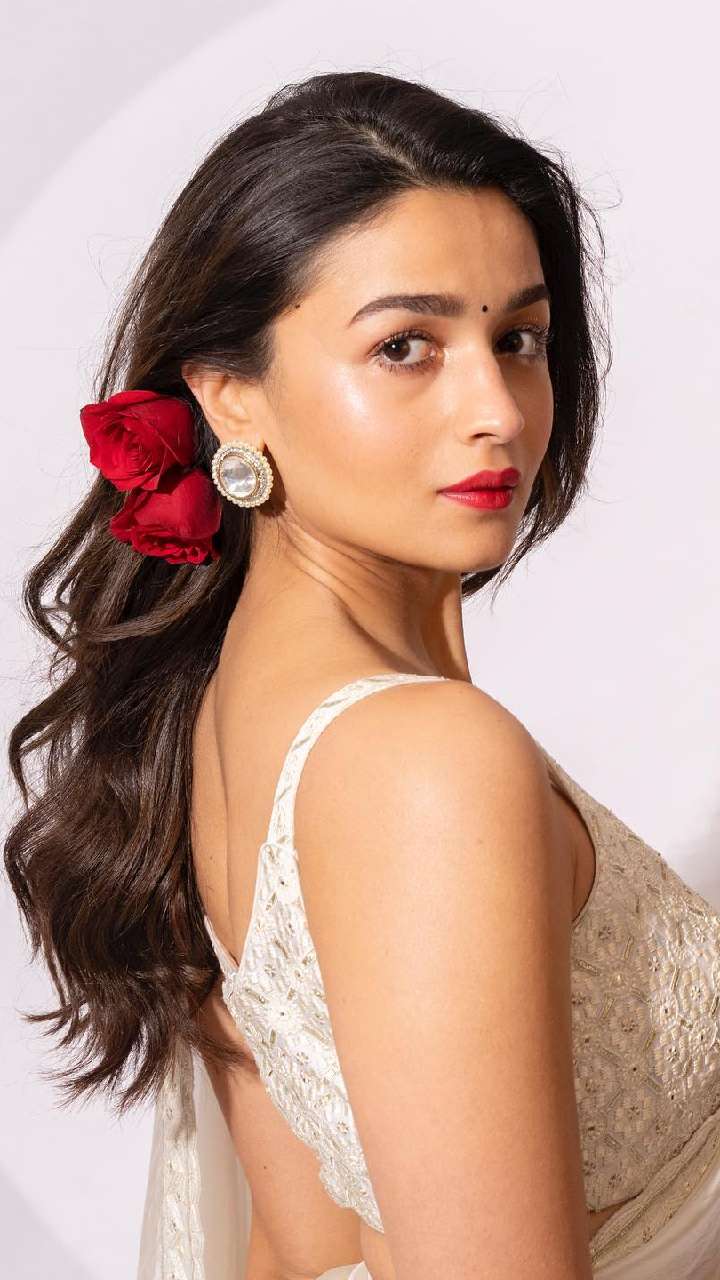 व्हाइट साड़ी और बालों में गुलाब के फूल के साथ आलिया भट्ट ने अपने लुक को काली बिंदी से पूरा किया है।