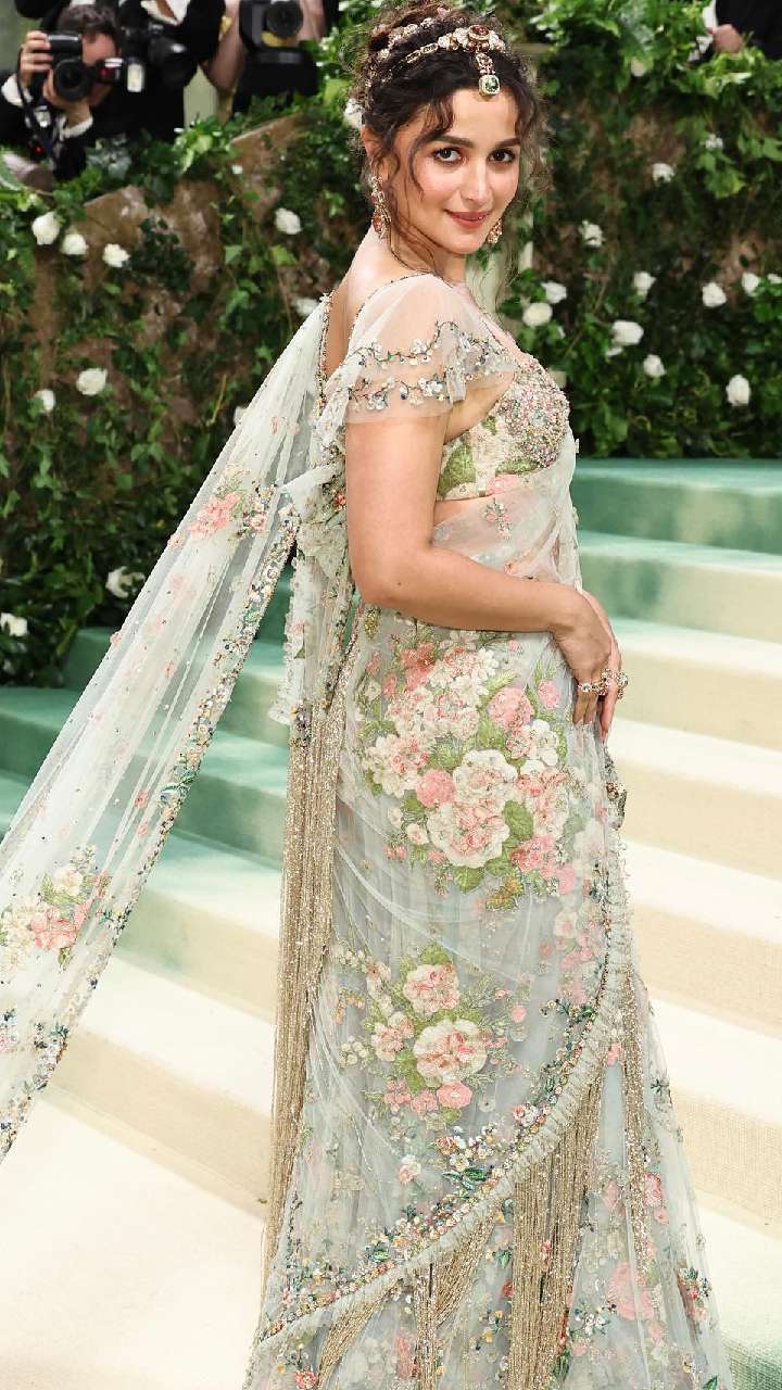 फैशन शो Met Gala 2024 में आलिया भट्ट ने अपनी अदाओं से सबका मन मोह लिया। इस दौरान एक्ट्रेस ने फ्लोरल साड़ी लुक कैरी किया था, जिसमें वह अप्सरा जैसी गजब ढा रही थीं। आलिया ने इस लुक में पिंक लिपस्टिक गोल्डन जूलरी और कजरारी आंखों ने महफिल में चार चांद लगा दिए।