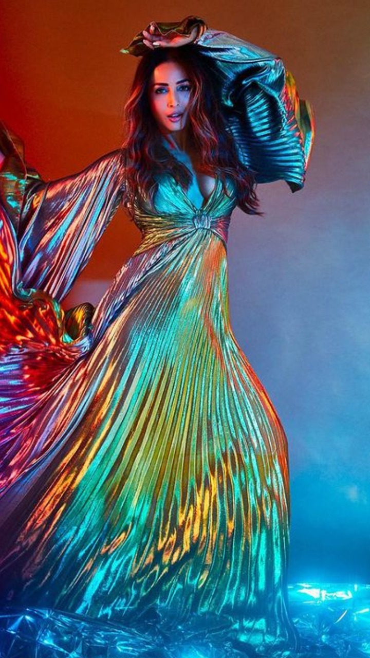 बॉलीवुड की सेक्सिएस्ट अदाकारा मलाइका अरोड़ा इस मल्टीकलर मेटैलिक ड्रेस में कहर ढहा रही हैं।