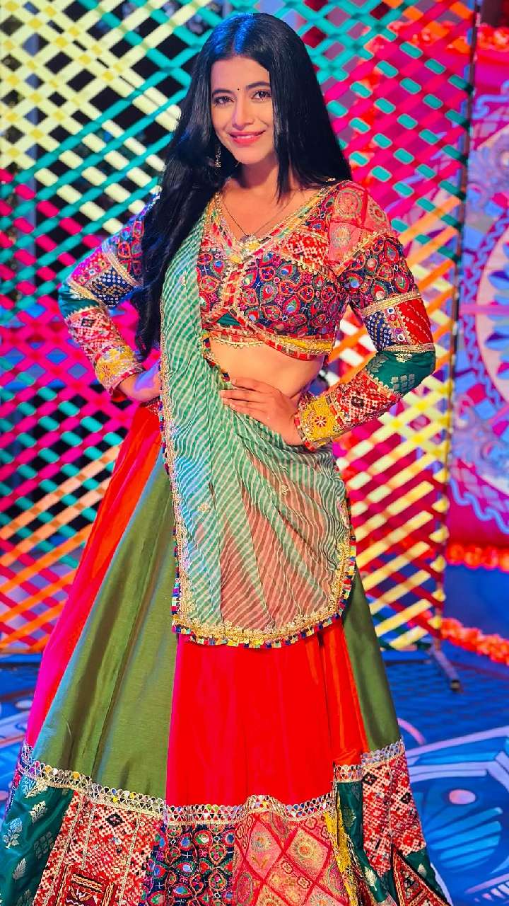 इस कलरफुल गुजराती लहंगे के साथ एक्ट्रेस का ब्लाउज बेहद अट्रैक्टिव लुक दे रहा है। आप इस लहंगे को कर्ली हेयर स्टाइल के साथ स्टाइल कर सकती हैं।