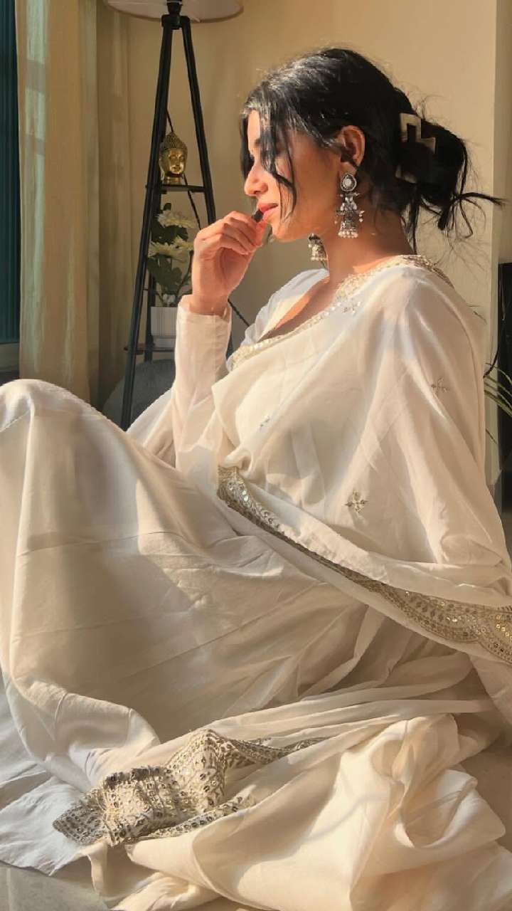 एथनिक लुक को कैरी करने के लिए आप एक्ट्रेस जैसी चिकनकारी कुर्ती को हैवी इयररिंग्स और स्टाइलिश हेयर स्टाइल के साथ कैरी कर सकती हैं।