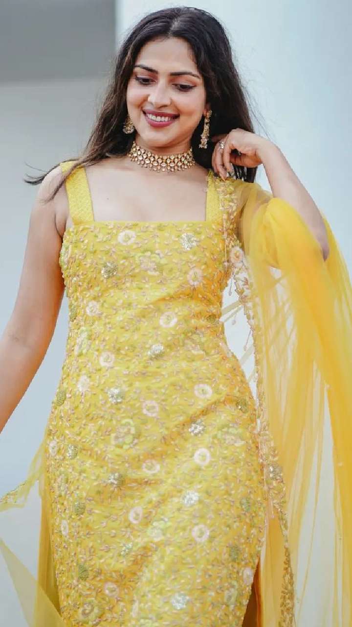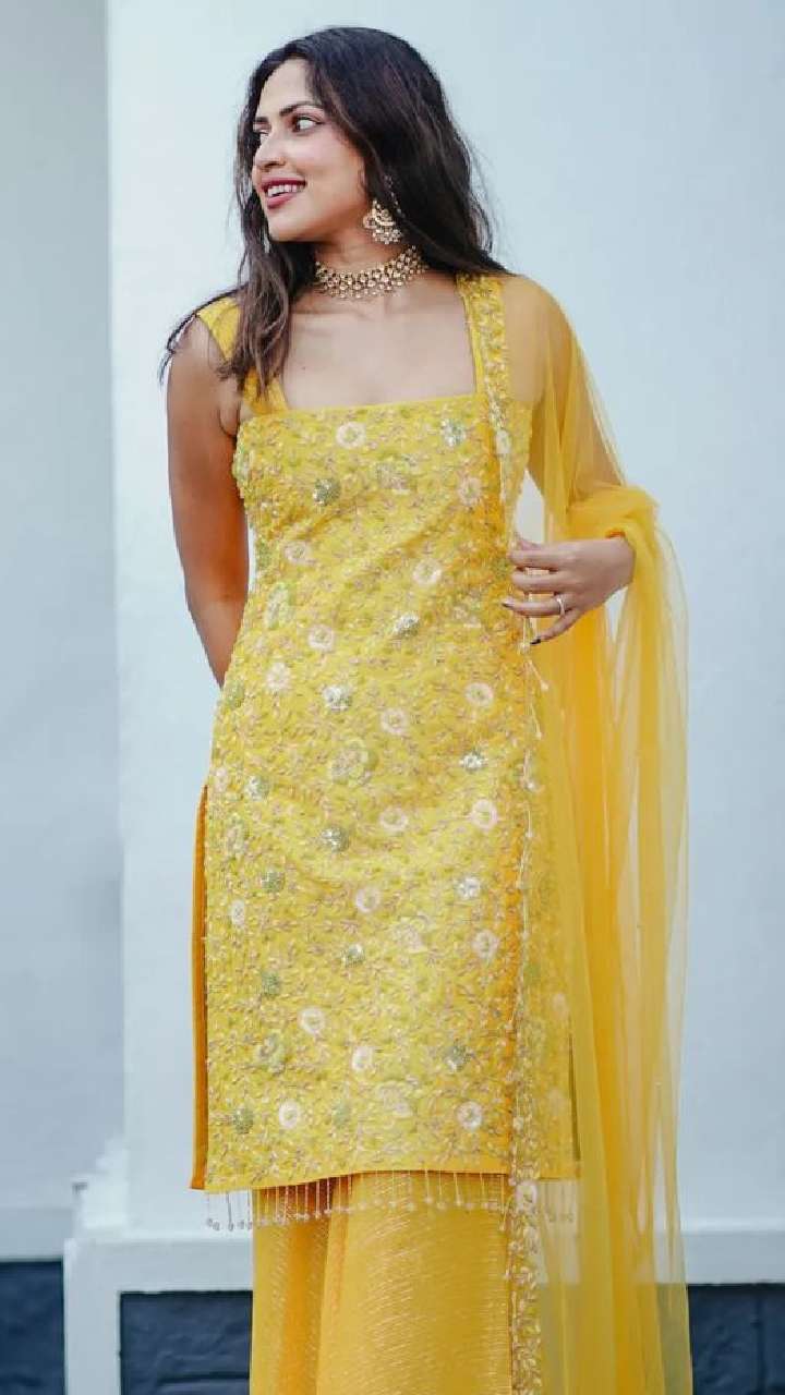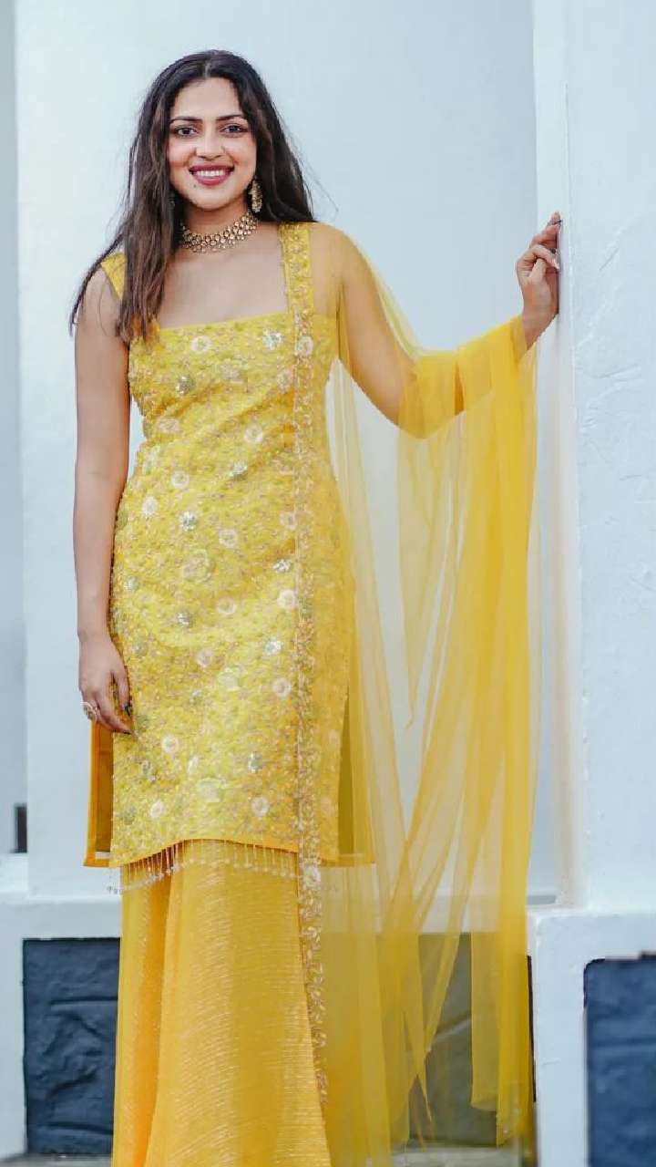 येलो कलर के एम्ब्रॉयडर्ड पंजाबी सूट में अमाला बेहद प्यारा लुक देती नजर आ रही है।