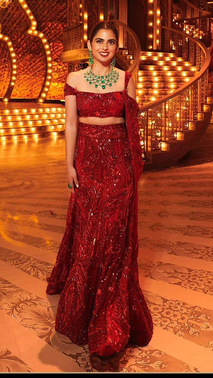 मुकेश अंबानी की लाड़ली ईशा अंबानी मनीष मल्होत्रा के रेड कलर के बॉडीकॉन लहंगे में काफी ग्लैमरस अंदाज में नजर आई।