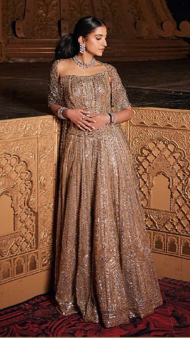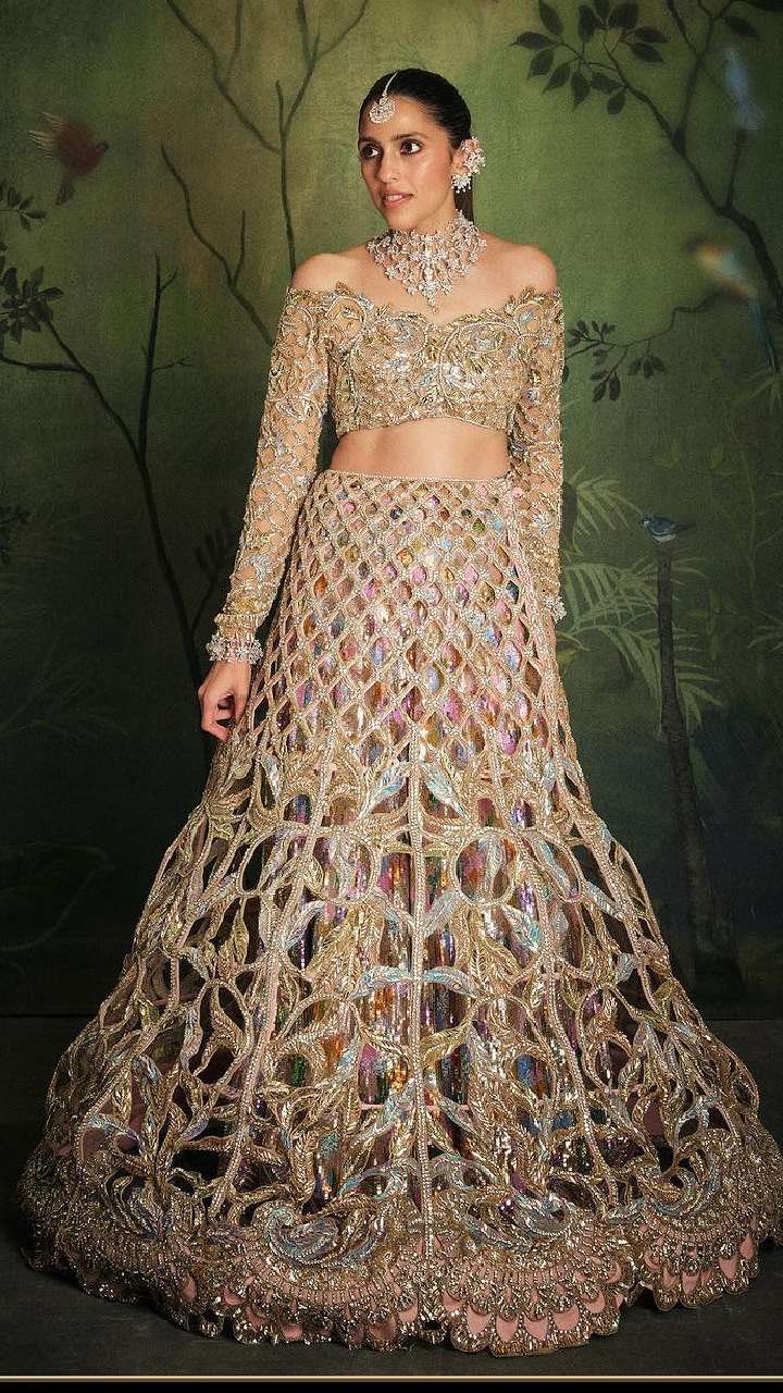 अंबानी परिवार की बहू श्लोका ने एक फंक्शन में मनीष मल्होत्रा का डिजाइन किया हुआ गोल्डन कलर जालीदार ग्लिटरी लहंगा कैरी किया था। जिसमें वो बला की खूबसूरत लग रही थीं।