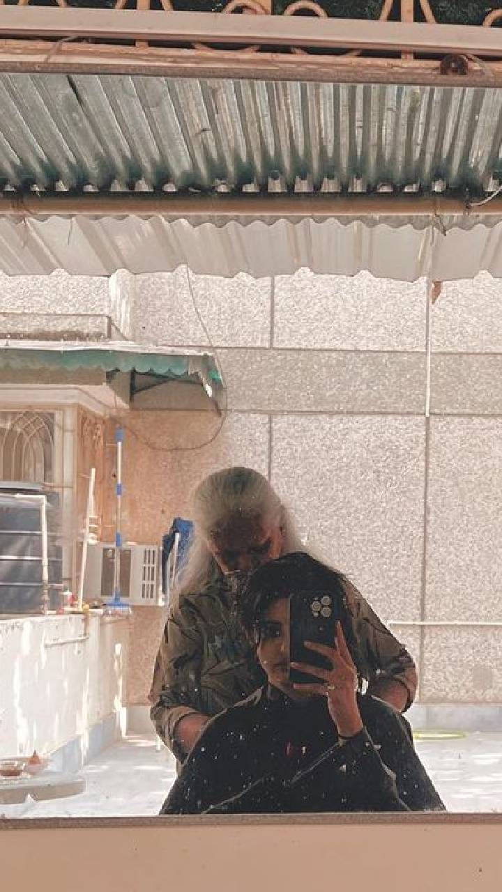 नव्या नवेली ने चाट के लुफ्त के साथ अपने हेयर भी कट करवाया है, जिस की उनहोंने मिरर सेल्फी शेयर की हैं।
