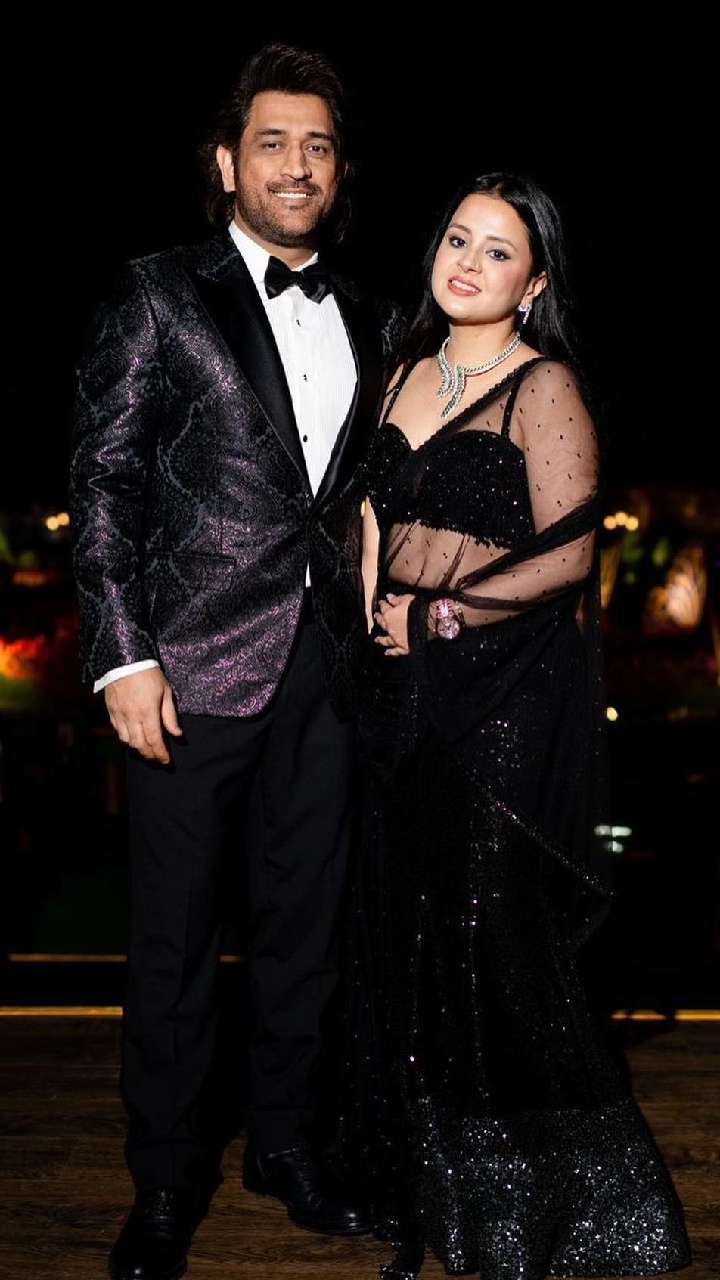 जामनगर में फेमस भारतीय क्रिकेटर एम एस धोनी अपनी लेडी लव साक्षी धोनी के साथ नजर आए। दोनों ने ब्लैक मैचिंग आउटफिट कैरी किया था।