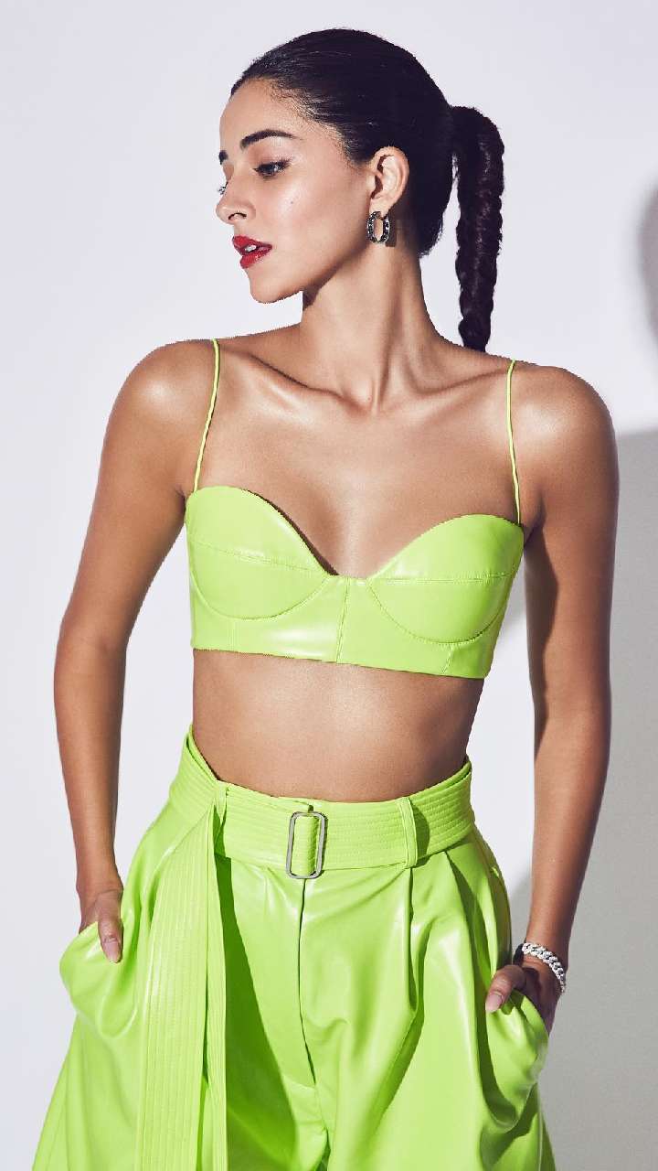 इस नियोन कलर की पेंट नूडल स्ट्रैप क्रॉप टॉप में अनन्या का ग्लैमरस लुक काफी शानदार है। इसके साथ उन्होंने ब्रेड हेयर स्टाइल और स्टड इयररिंग पेयर किए हैं।