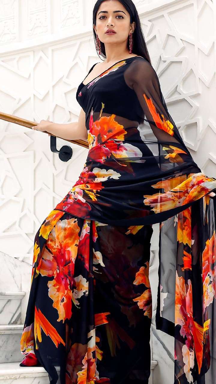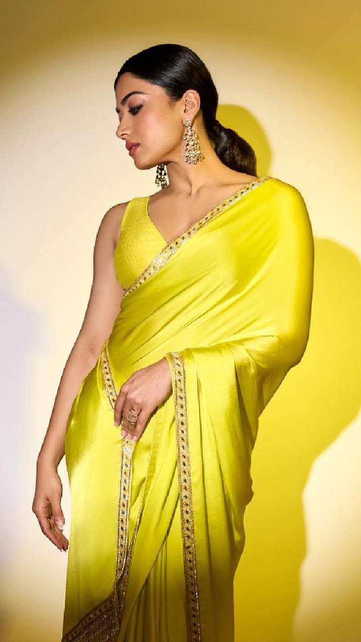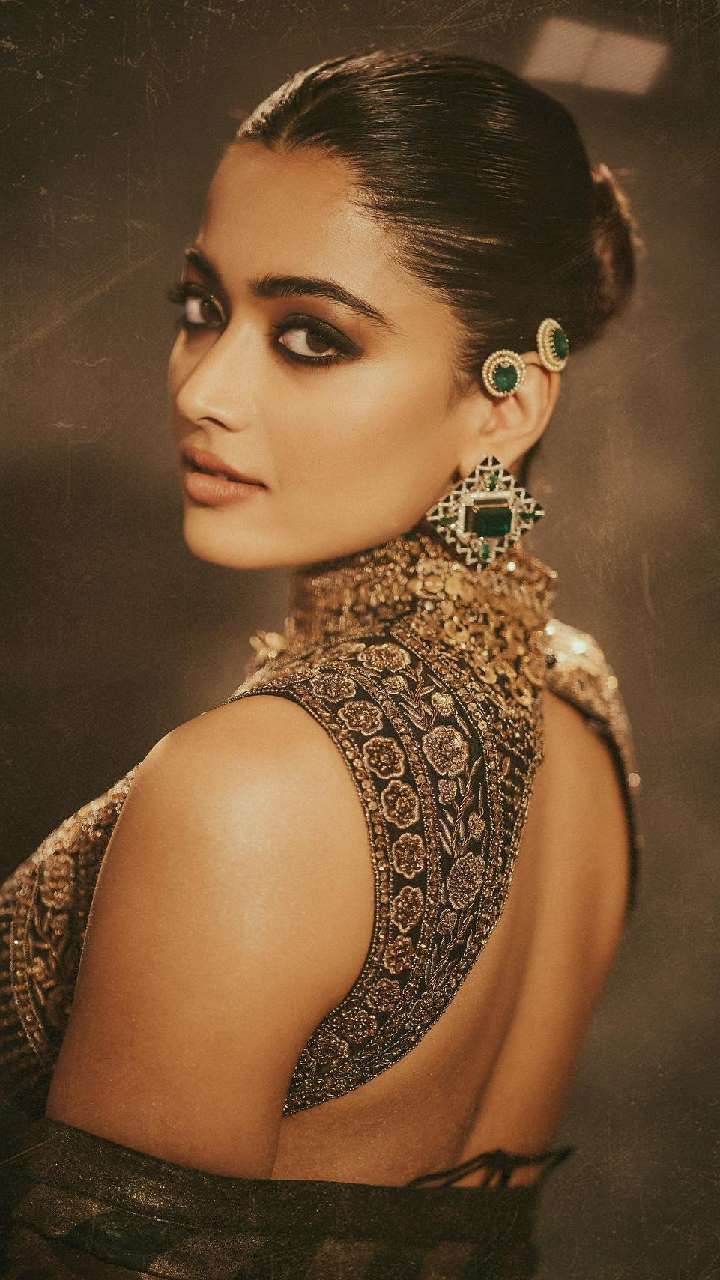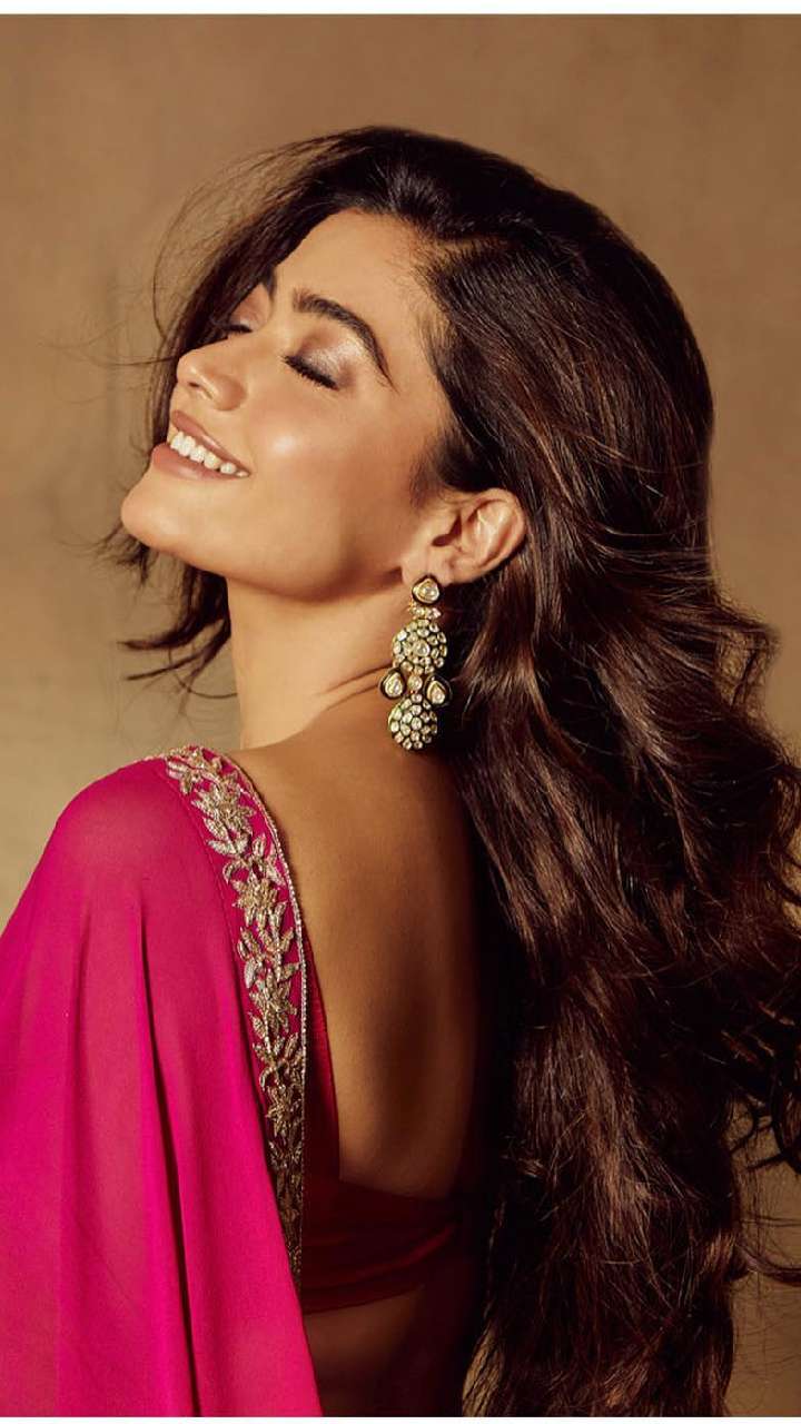 रश्मिका ने प्लेन साड़ी के साथ डेंगल इयररिंग कैरी किया हुआ है। जो काफी एलिगेंट लुक दे रहा है।