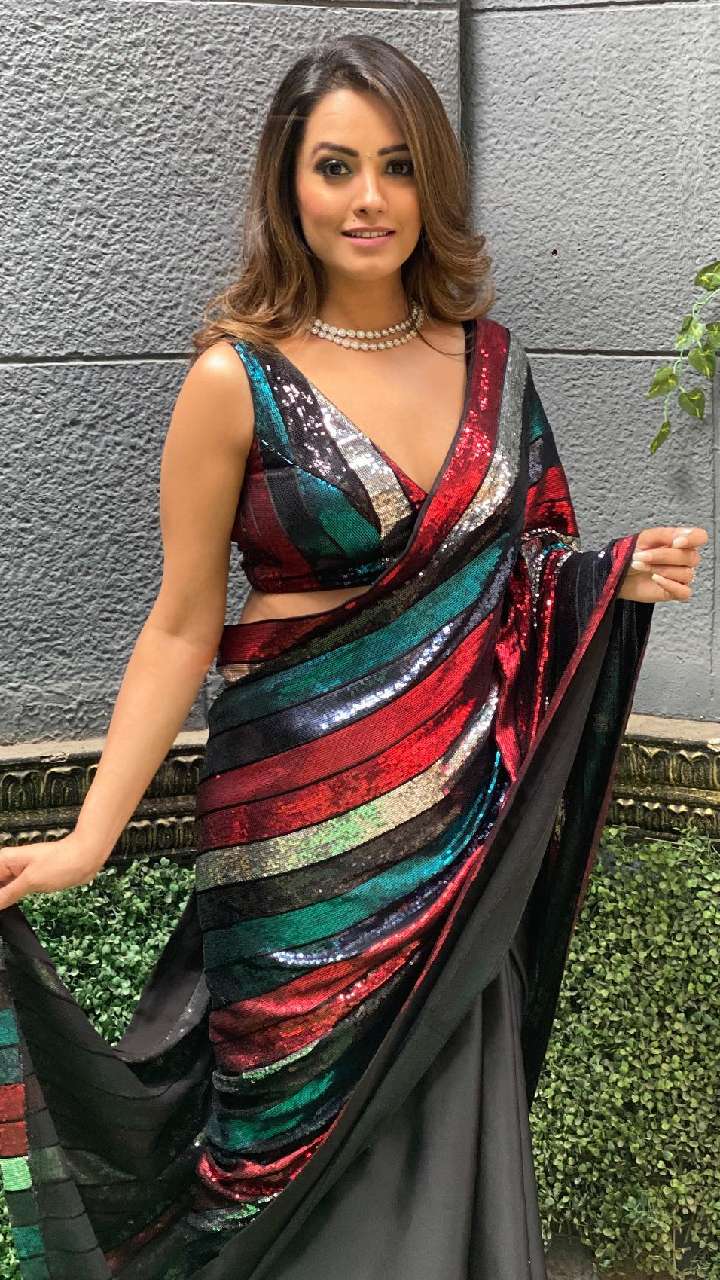 अनीता हसनंदानी की सिक्विन वर्क साड़ी डीप वी नेक ब्लाउज बेहद स्टाइलिश और बोल्ड लुक दे रहा है। यंग गर्ल्स के लिए ये बेस्ट ऑप्शन है।