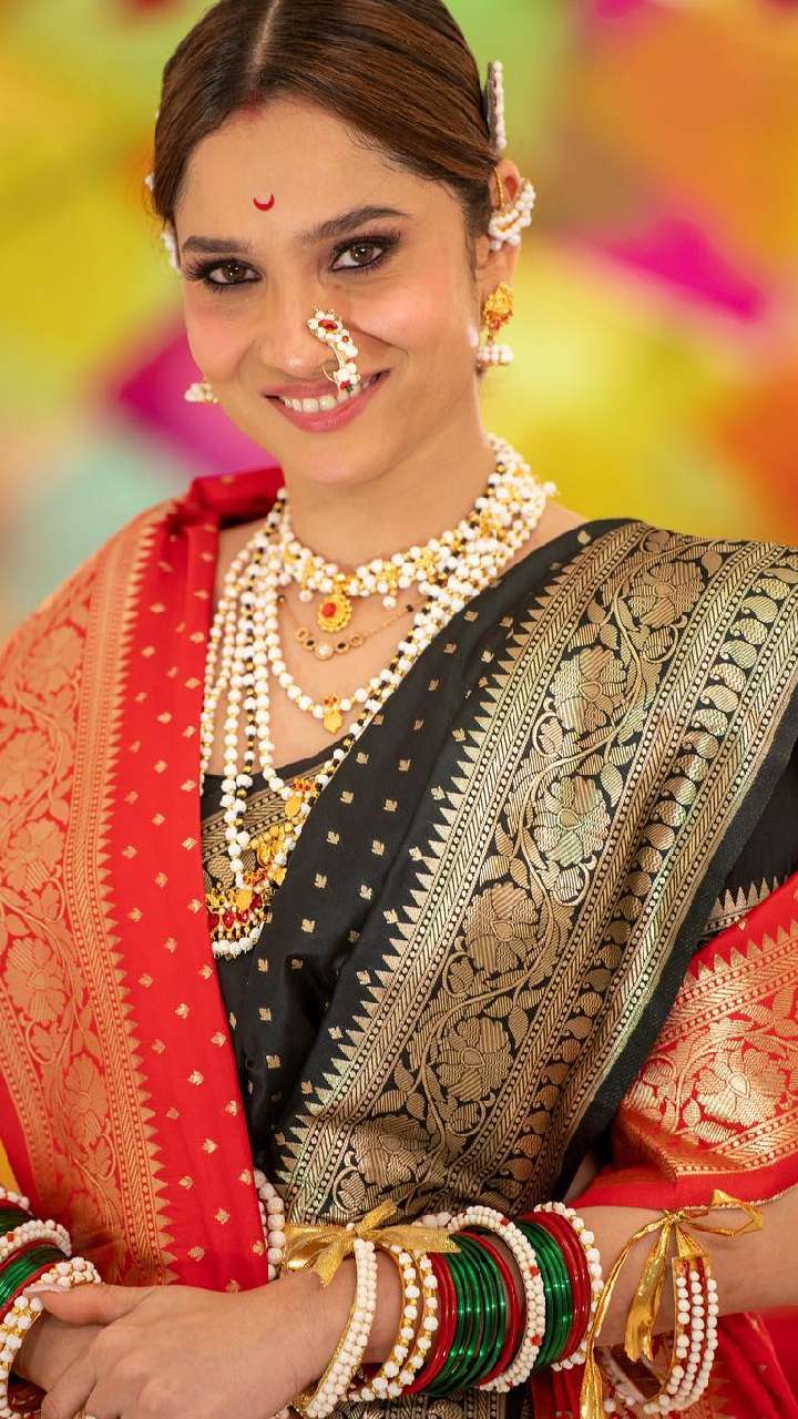 ब्लैक और रेड साड़ी में अंकिता लोखंडे का ये मराठी लुक बहुत अट्रैक्टिव लग रहा है। आप भी मराठी लुक के साथ मोती वाला नेकलेस कैरी कर सकती हैं।