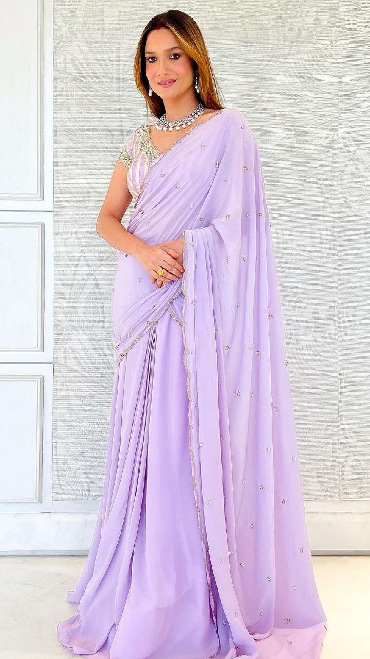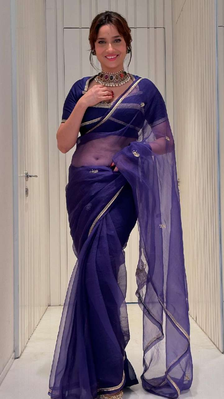 अंकिता लोखंडे पर्पल कलर की ऑर्गेंजा साड़ी में बेहद खूबसूरत लग रही हैं। उनका यह लुक गर्मियों के लिए एकदम बेस्ट है।
