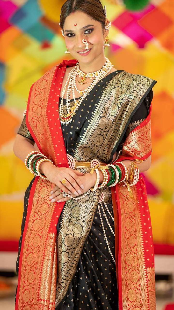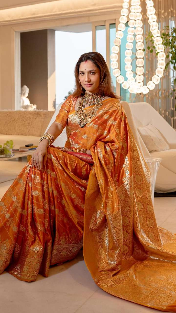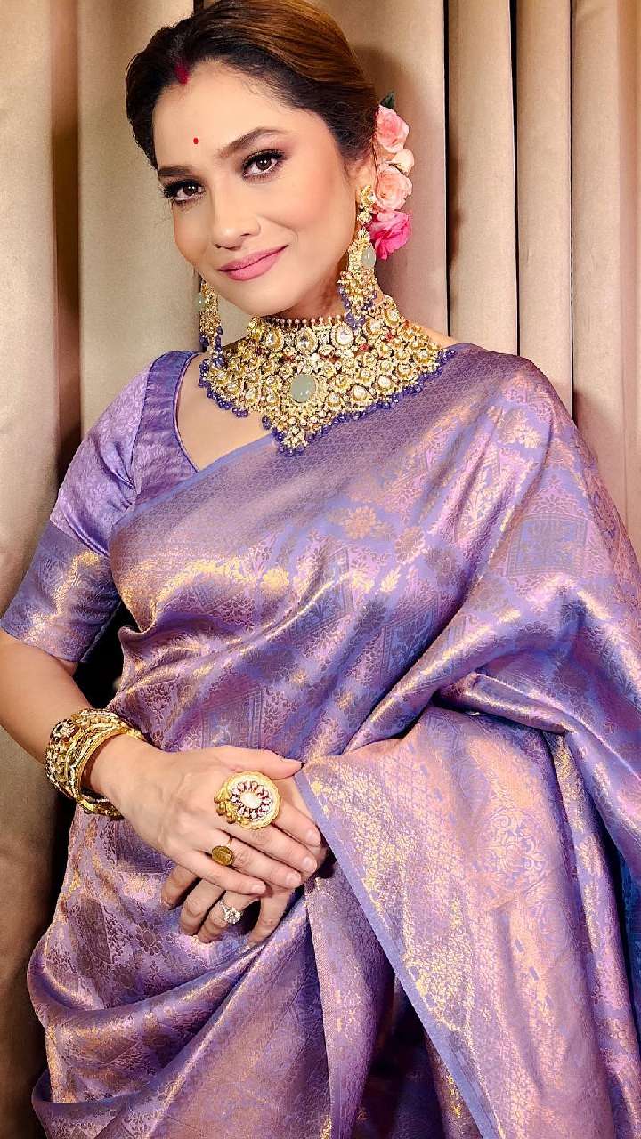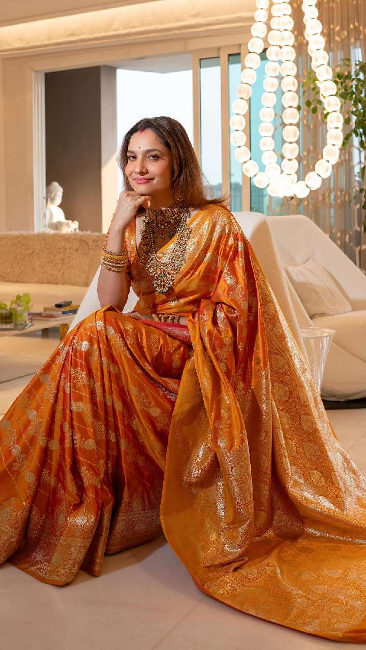 अंकिता लोखंडे ने हाल में इंस्टाग्राम पर मस्टर्ड कलर की येलो सिल्क जरी वर्क साड़ी में अपना ब्यूटीफुल लुक शेयर किया है। इसके साथ उनका डबल लेयर नेकपीस जंच रहा है।