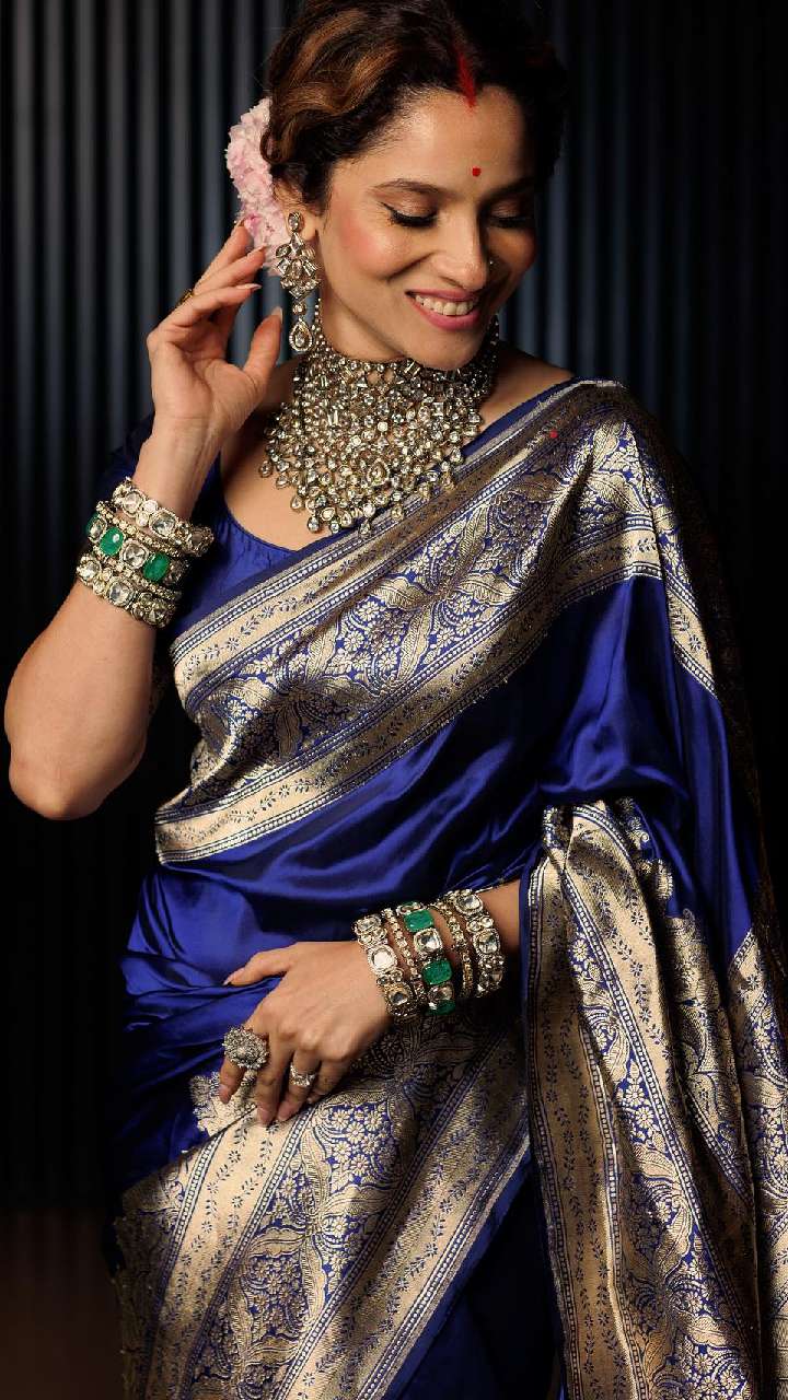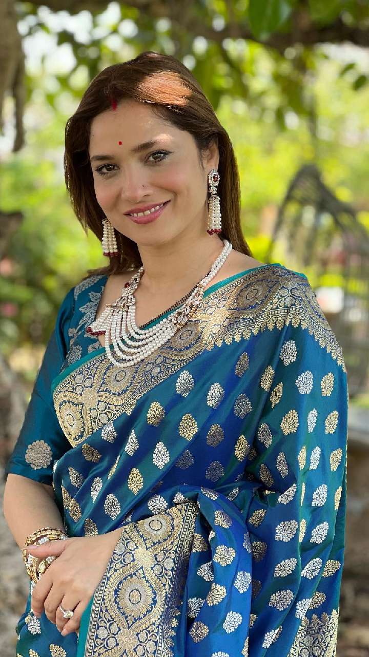 अंकिता लोखंडे की रॉयल ब्लू जरी बॉर्डर सिल्क साड़ी पर्ल मल्टीलेयर नेकपीस लुक न्यूली ब्राइड के लिए परफेक्ट है।