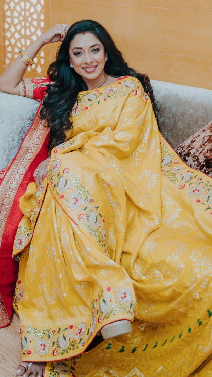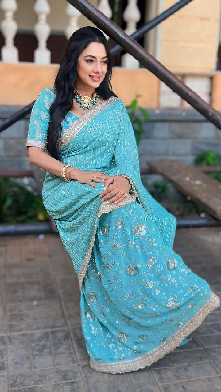 अनुपमा बॉर्डर वर्क की जॉर्जेट साड़ी में शानदार दिखाई दे रही हैं। इस तरह की साड़ी शादी फंक्शन में कैरी कर सकती हैं।