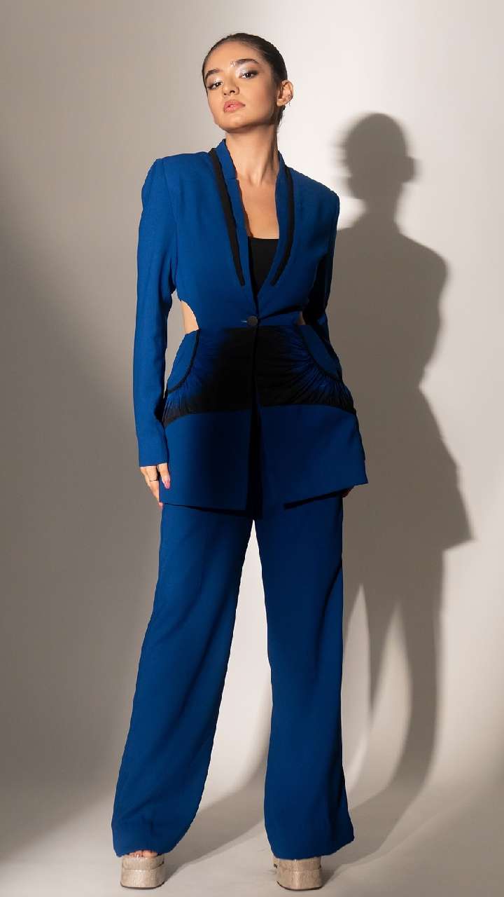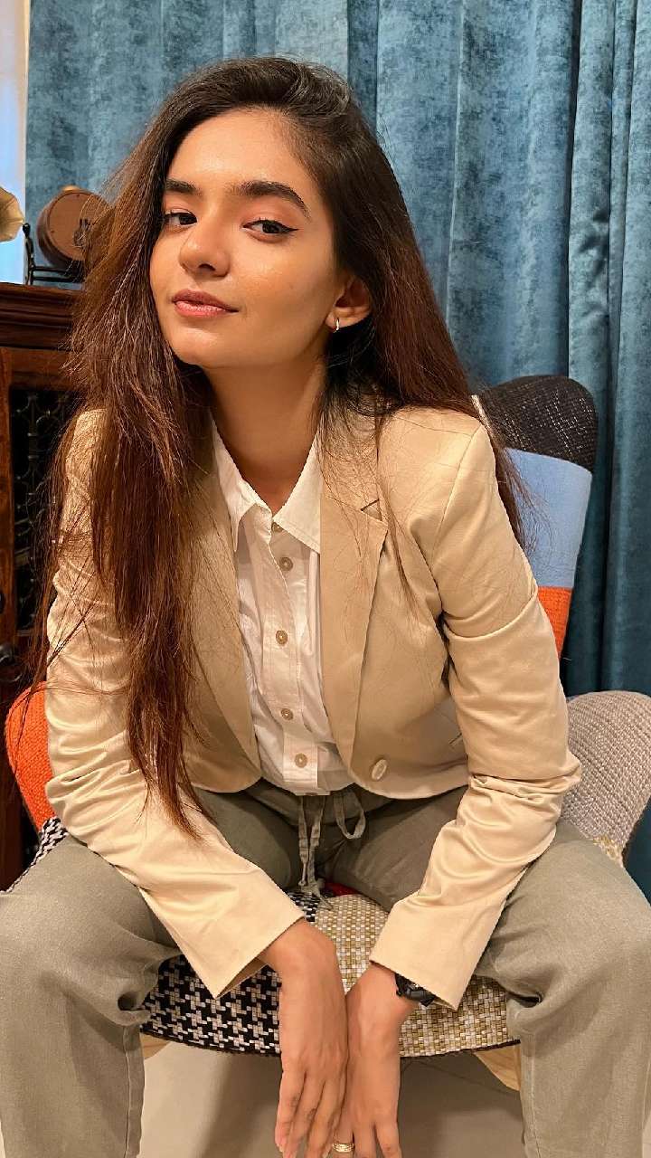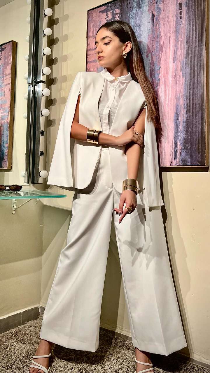 अनुष्का सेन का लूज पेंट के साथ कॉलर शर्ट मैचिंग ब्लेजर काफी ग्लैमरस लुक दे रहा है। डीवा के ब्लेजर की बाजू पर कट से स्टाइलिश लुक दिया हुआ है।