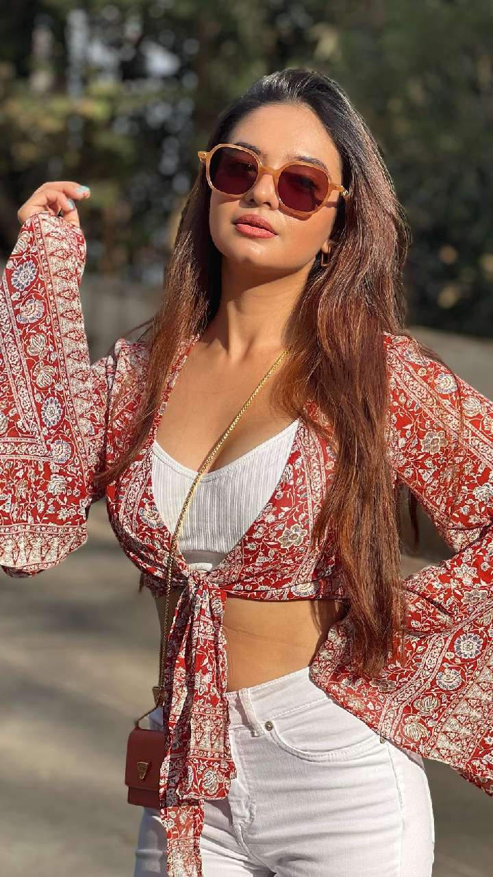 अभिनेत्री का ब्लू लाइनिंग प्रिंट ब्रालेट टॉप भी समर के लिए अच्छा ऑप्शन है। ये आपके लुक को हॉट बना देगा।