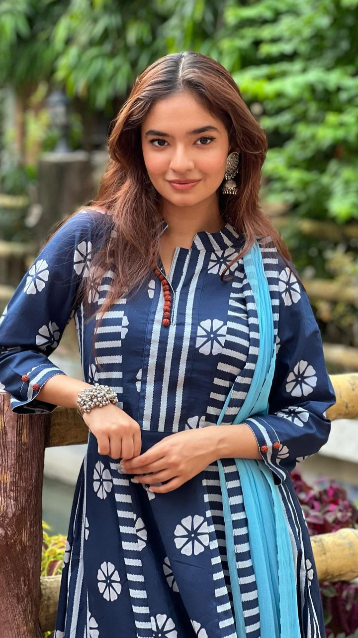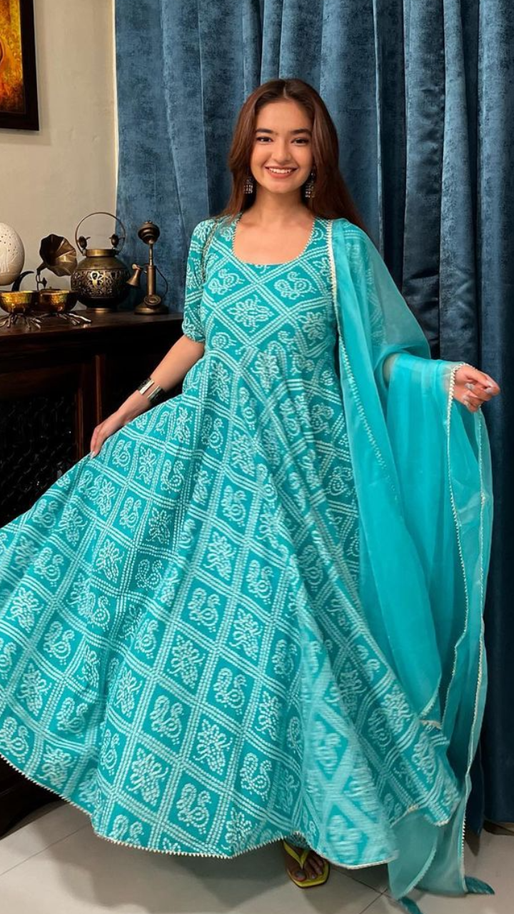 अनुष्का सेन इस ब्लू कलर के प्रिंटेड लहंगे में बला की खूबसूरत दिख रही हैं। दीवा के इस ऑउटफिट को आप दीवाली पूजा में पहन सकते हो।